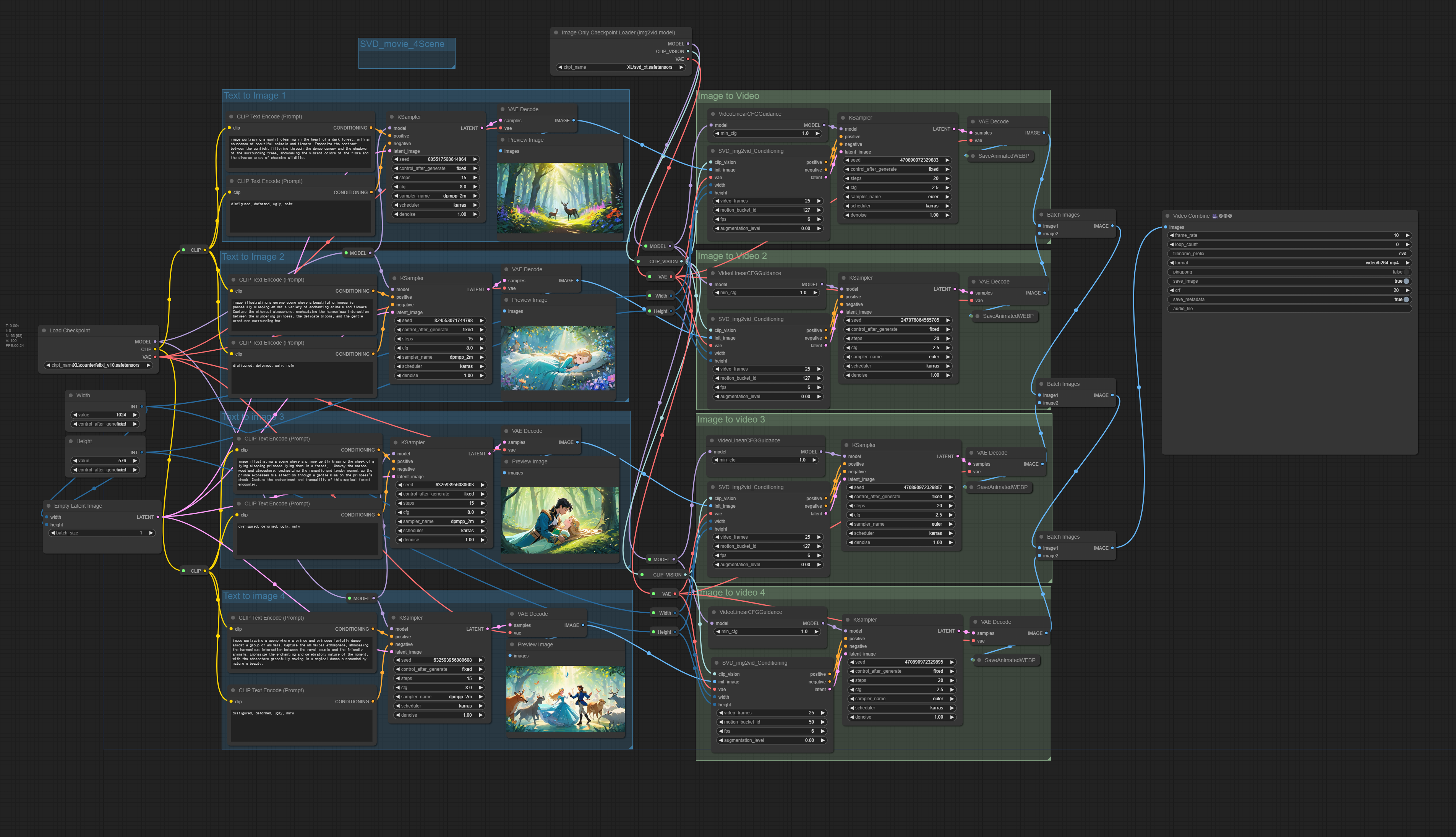 직접 비디오를 만들어보기 위해 잠자는 숲속의 공주 이야기를 사용해 생성해 보았습니다. 4가지 장면이 포함된 비디오를 만들기 위해 text-to-image와 image-to-video 블록을 복제해서 늘렸고, ChatGPT를 사용해 프롬프트를 생성했습니다.