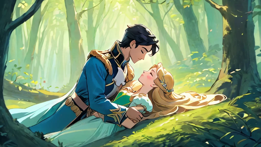 프롬프트: image illustrating a scene where a prince, lying down, gently kisses the cheek of the sleeping princess. Emphasize the tender and romantic atmosphere, capturing the quiet intimacy of the moment as the prince expresses his affection through the gentle touch of his lips on the princess's cheek. Highlight the serenity and magic surrounding the enchanting scene.