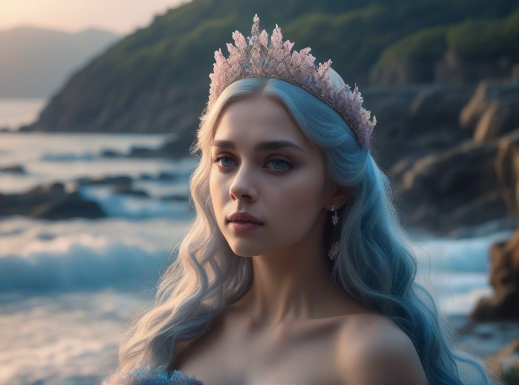 프롬프트: A portrait of a fairy princess, tiara, long flowery hair, fantasy, soft background, sea-like , bluish dress, bare shoulders, UHD, 8k, beautiful composition, a modern surrealistic <lora: add_detail_xl>