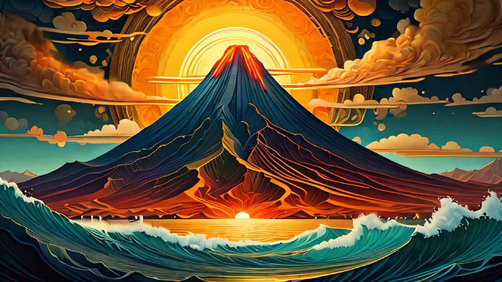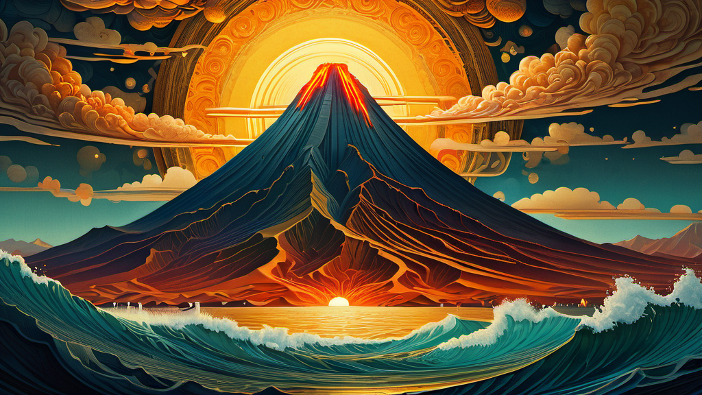 프롬프트: very beautiful insanely detailed image of glowing seascape volcano in golden spring". beautiful golden mountains, bright dark yellow ornate sun, by Victo_Ngai, Oleksandra Ekster, Malevich, Vladyslav Yerko and Alexander Jansson, Vladyslav Yerko! Very Complex perfect elegant composition! linen gesso acrylic paper, epic Dramatic lighting! Razor-sharp quality insanely detailed, deep colors realistic masterpiece<lora:xl_more_art-full_v1:0.5>