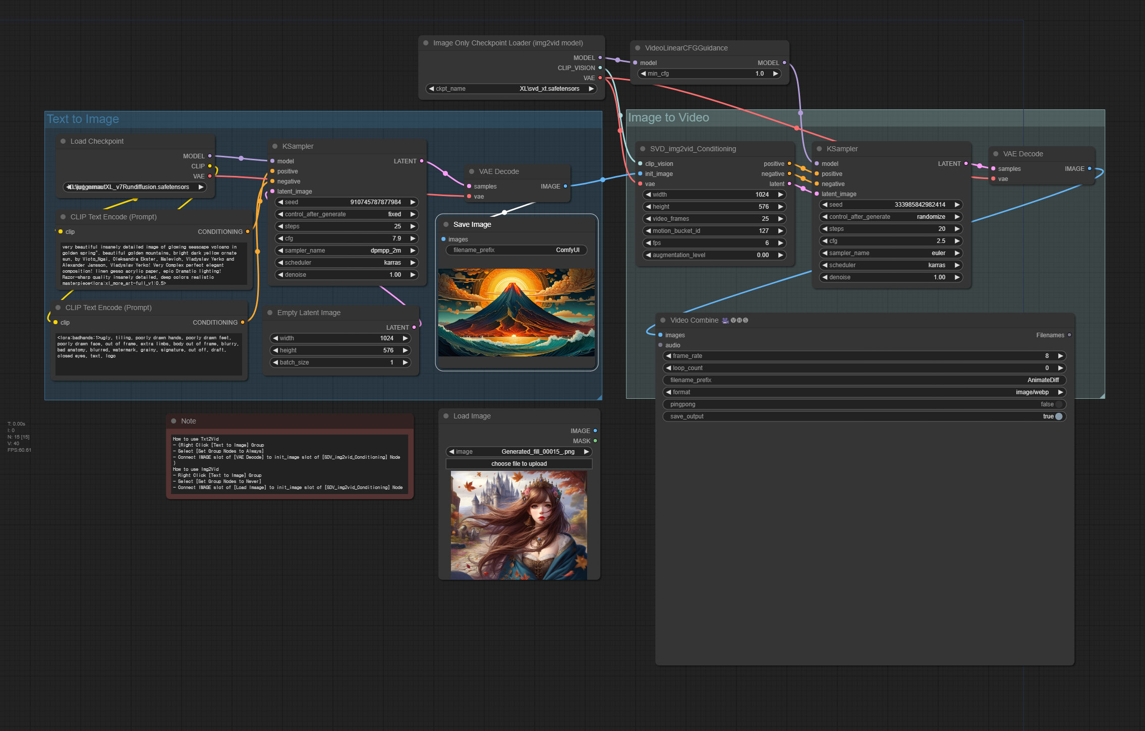 txt2vid는 먼저 SDXL 모델을 사용하여 초기 이미지를 만든 뒤, SVD XT 모델을 사용하여 비디오클립을 생성하는 방식입니다.