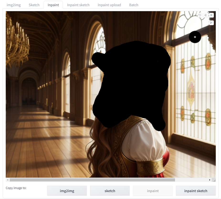 다른 이미지를 수정하고 싶다면, 인페인트 탭을 누르고 캔버스를 클릭해 원하는 이미지를 불러올 수도 있습니다. 그러면 아래와 같은 상태가 됩니다. 여기에서 마우스로 까만 점을 드래그하면서 새로 그리고 싶은 곳을 칠해주면 됩니다. 이 때 오른쪽위에 있는 버튼 4개중 아래쪽 버튼을 클릭하면 까만 점(브러시)의 크기를 변경할 수 있습니다.