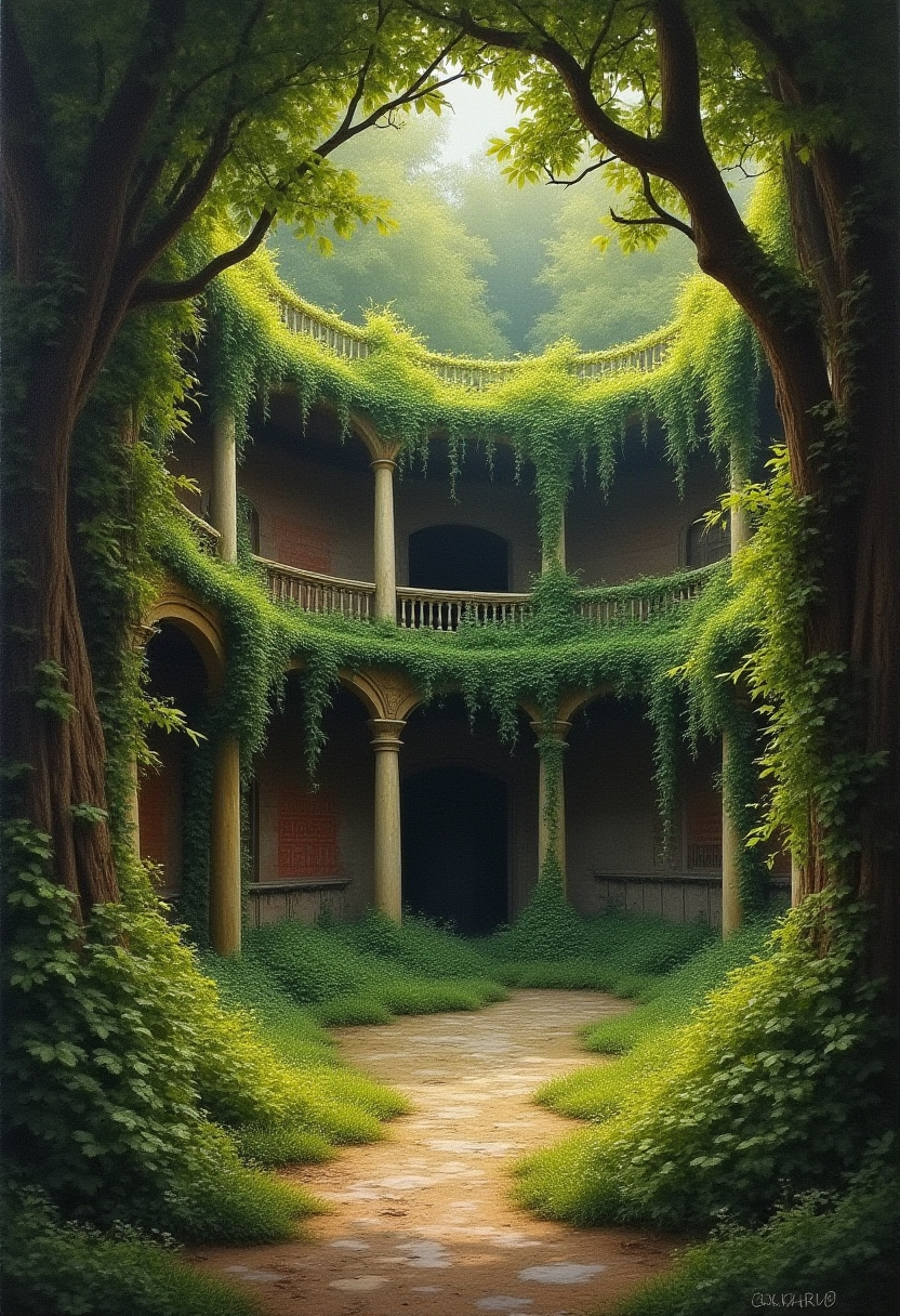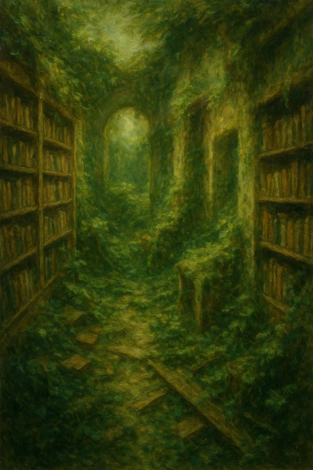 An abandoned library overgrown with vegetation, romantic oil painting style, mystical atmosphere, light bird's eye view, green and ochre palette, reference: ruins of Giverny(초목으로 무성한 버려진 도서관, 낭만적인 유화 스타일, 신비로운 분위기, 가벼운 조감도, 녹색과 황토색 팔레트, 참고: 지베르니의 폐허)