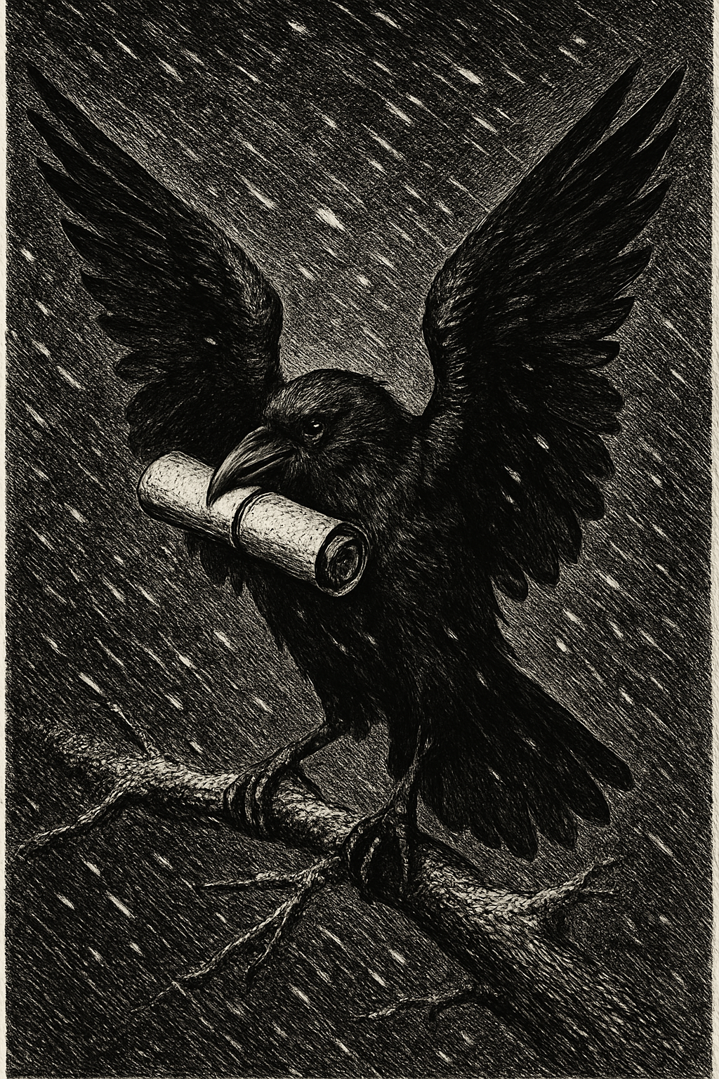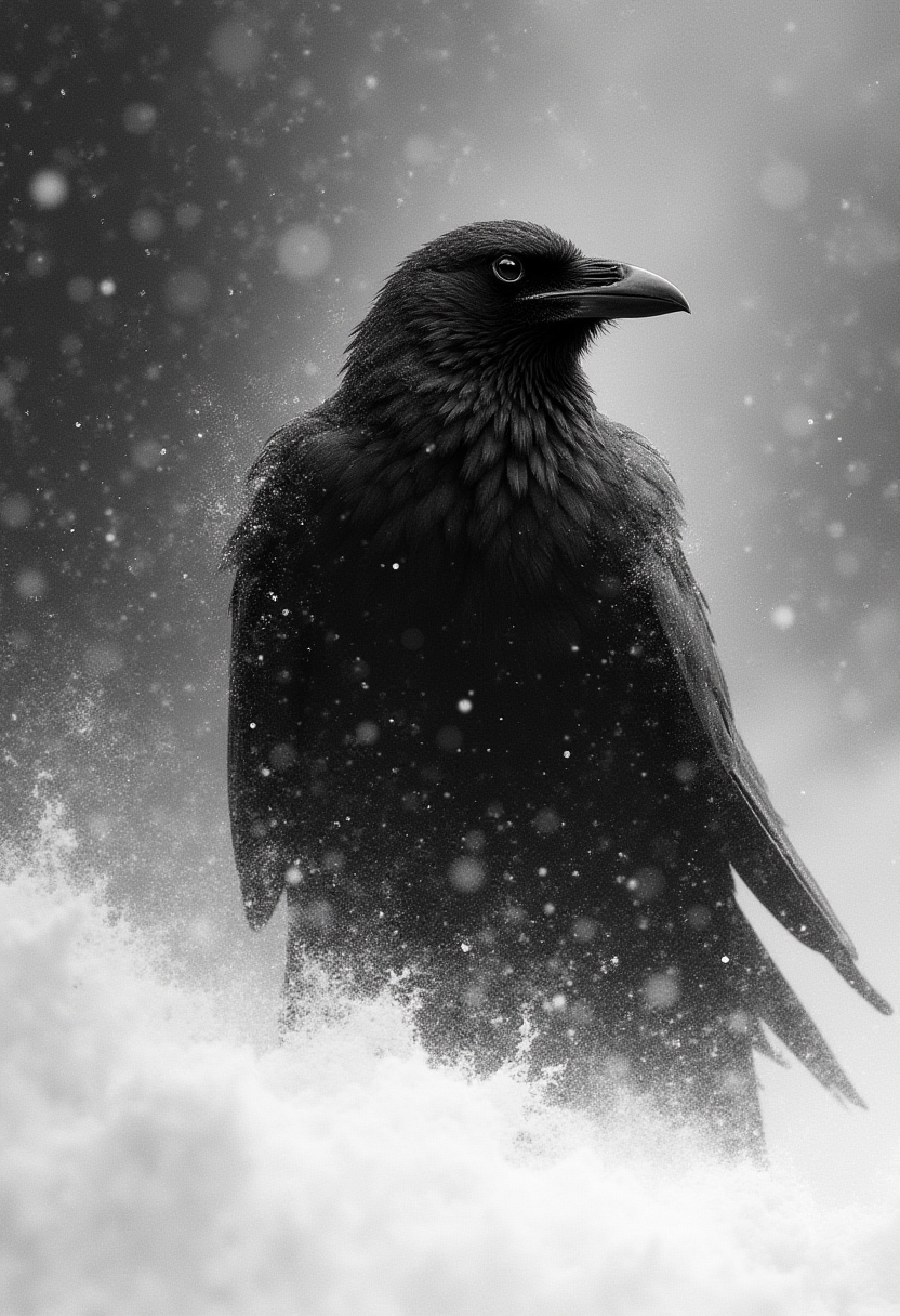 A messenger raven in a snowstorm, black engraving style, dramatic and frozen atmosphere, centered composition, sharp black and white, Illustrations in the style of Gustave Doré(눈보라 속 전령 까마귀, 검은 판화 스타일, 극적이고 얼어붙은 분위기, 중앙 구도, 선명한 흑백, 구스타브 도레 스타일의 일러스트레이션).