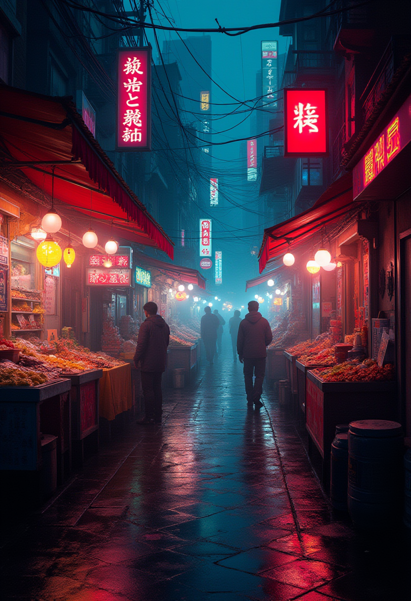 A night market in a cyberpunk alley, concept art style, overloaded and colorful atmosphere, depth blur, multicolored neon palette, Blade Runner and Akira inspiration(사이버 펑크 골목의 야시장, 컨셉 아트 스타일, 과부하되고 화려한 분위기, 깊이 흐림, 여러 가지 색상의 네온 팔레트, 블레이드 러너와 아키라에서 영감을 받았음.)