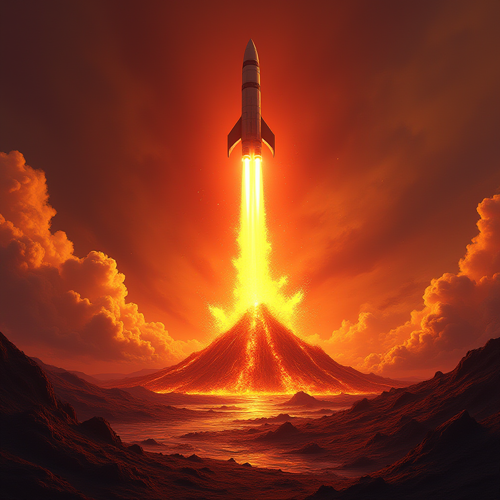 A rocket launched from an active volcano, explosive digital art style, chaotic atmosphere, diagonal composition, red-gold palette, inspired by science fiction comics(활화산에서 발사된 로켓, 폭발적인 디지털 아트 스타일, 혼란스러운 분위기, 대각선 구도, 공상 과학 만화에서 영감을 얻은 레드 골드 팔레트)
