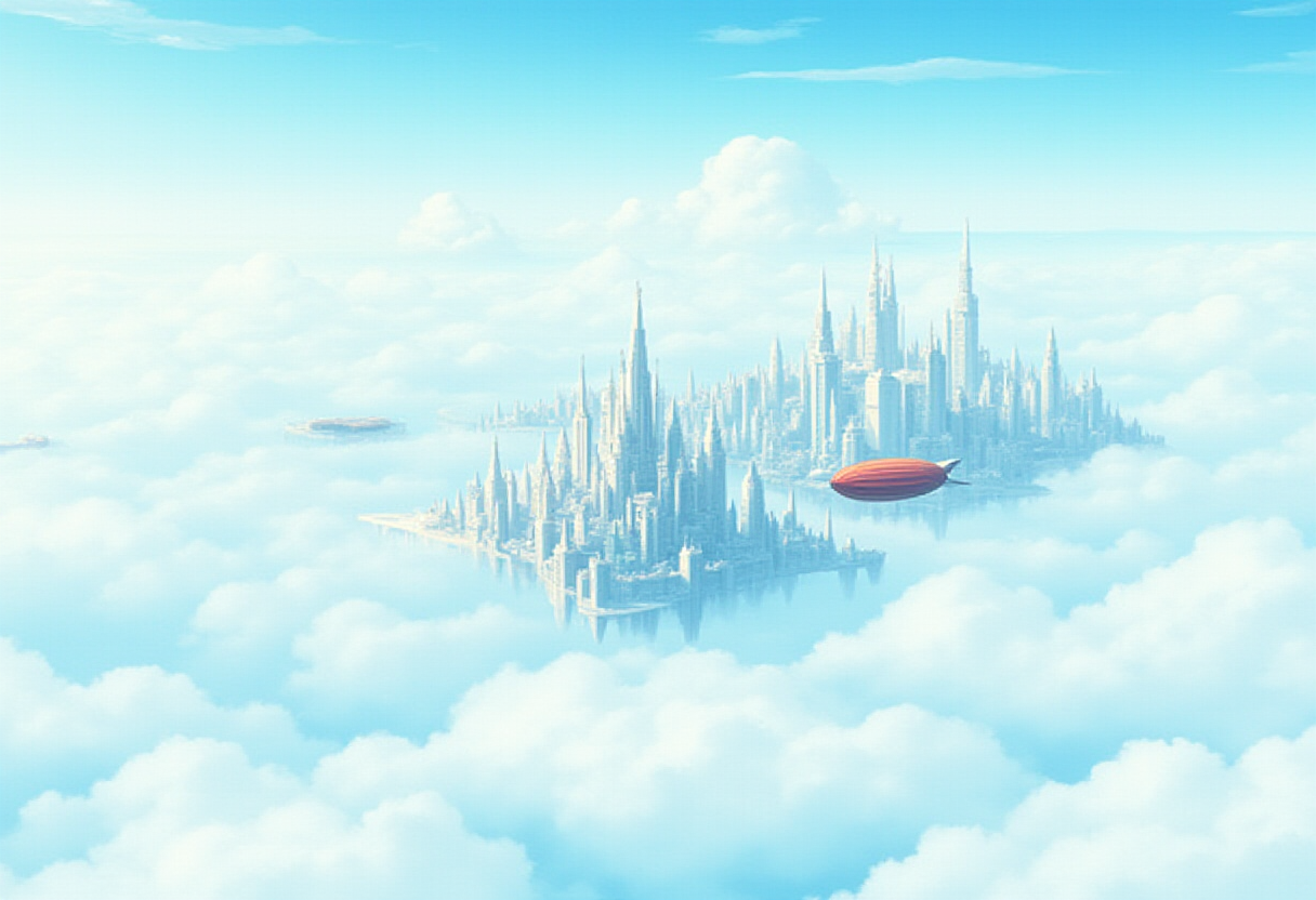 A city suspended in the clouds, pastel watercolor style, dreamlike and peaceful atmosphere, panoramic view from an airship, palette of light blues and whites, visual reference: Ghibli / Laputa.(구름에 떠 있는 도시, 파스텔 수채화 스타일, 몽환적이고 평화로운 분위기, 비행선에서 바라본 파노라마, 밝은 파란색과 흰색의 팔레트, 시각적 참조: 지브리 / 라퓨타)