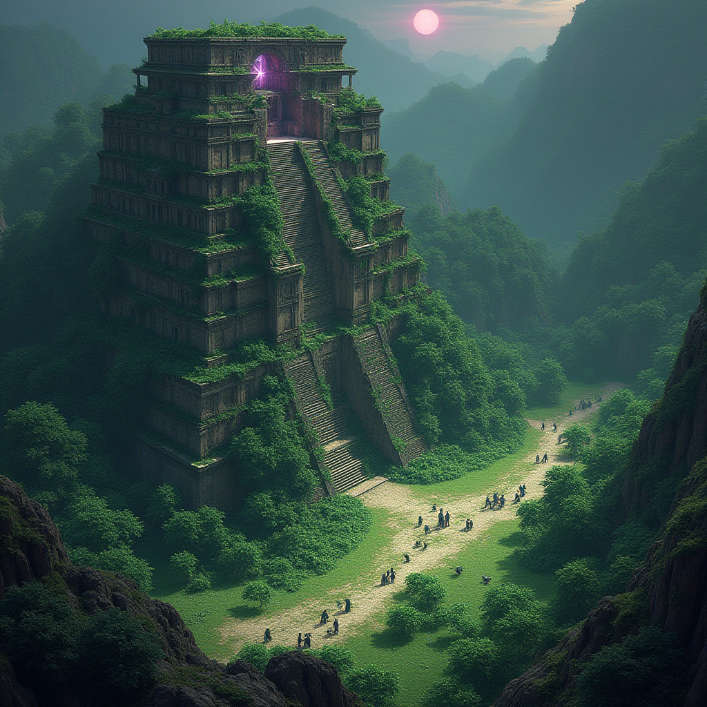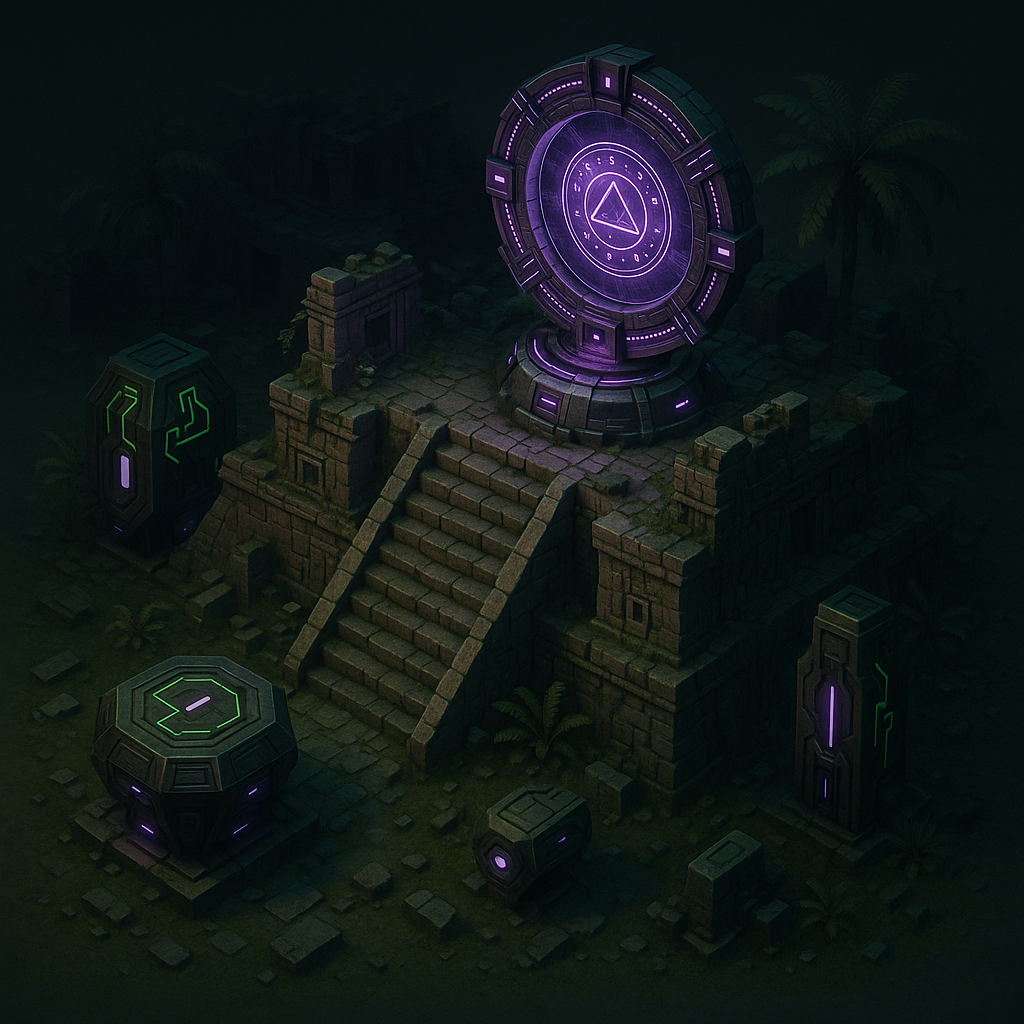 A Mayan ruin invaded by alien technologies, isometric 3D style, mysterious and ancient atmosphere, green and purple palette, In the style of the movie Stargate(외계 기술에 의해 침략 된 마야 유적, 등각 투영 3D 스타일, 신비하고 고대적인 분위기, 녹색과 보라색 팔레트, 영화 스타 게이트 스타일)