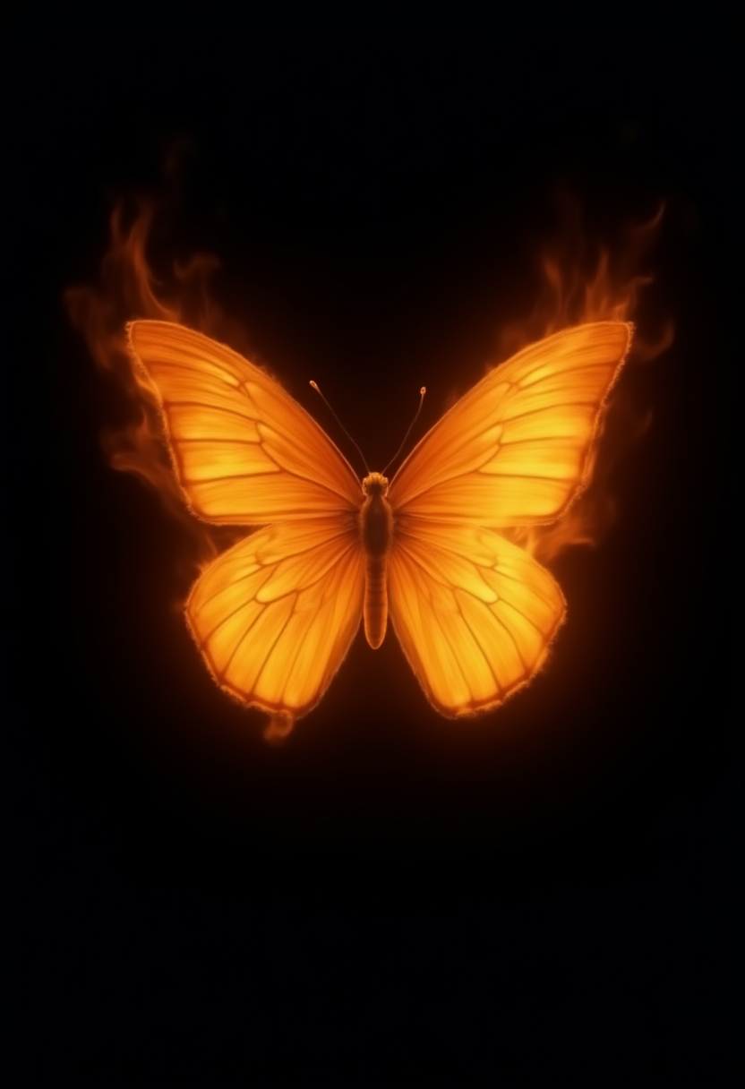 A burning butterfly in slow motion on a black background, dramatic ultra-realistic style, intense atmosphere, minimal background, bright orange palette on deep black, cinematic effect(검은 색 배경에 슬로우 모션으로 불타는 나비, 극적인 초현실적 스타일, 강렬한 분위기, 최소한의 배경, 진한 검정색에 밝은 주황색 팔레트, 영화 효과)