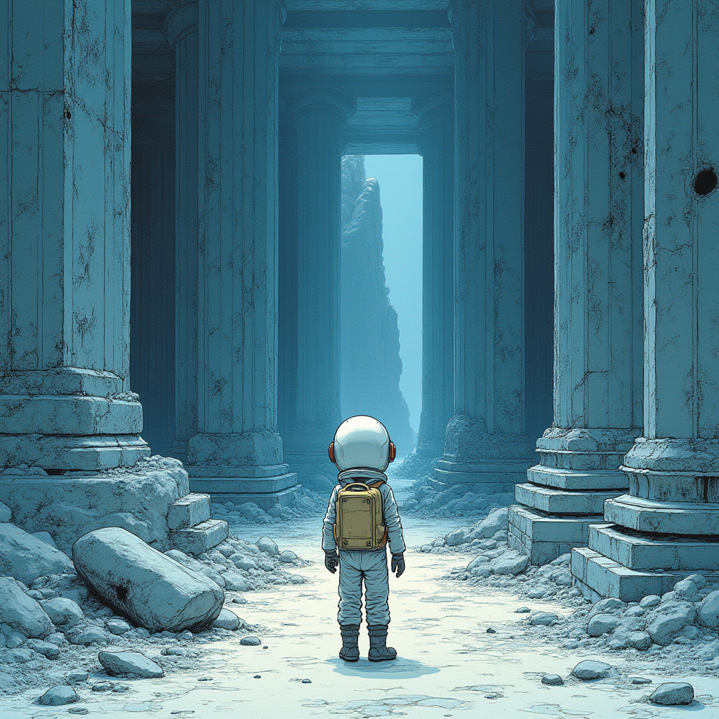 A child in a spacesuit discovering an ancient temple, European comic book style, metaphysical and contemplative atmosphere, wide shot, blue-grey palette, reference: Moebius(우주복을 입은 아이가 고대 신전을 발견하는 모습, 유럽 만화 스타일, 형이상학적이고 명상적인 분위기, 와이드 샷, 청회색 팔레트, 참조: 뫼비우스)