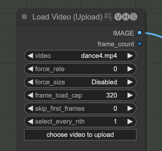 그 다음 [Load Video(Upload)] 노드에 넣어줍니다. 여기에서 frame_load_cap은 최대 사용 프레임 수입니다. 테스트용이면 16으로 설정하세요.