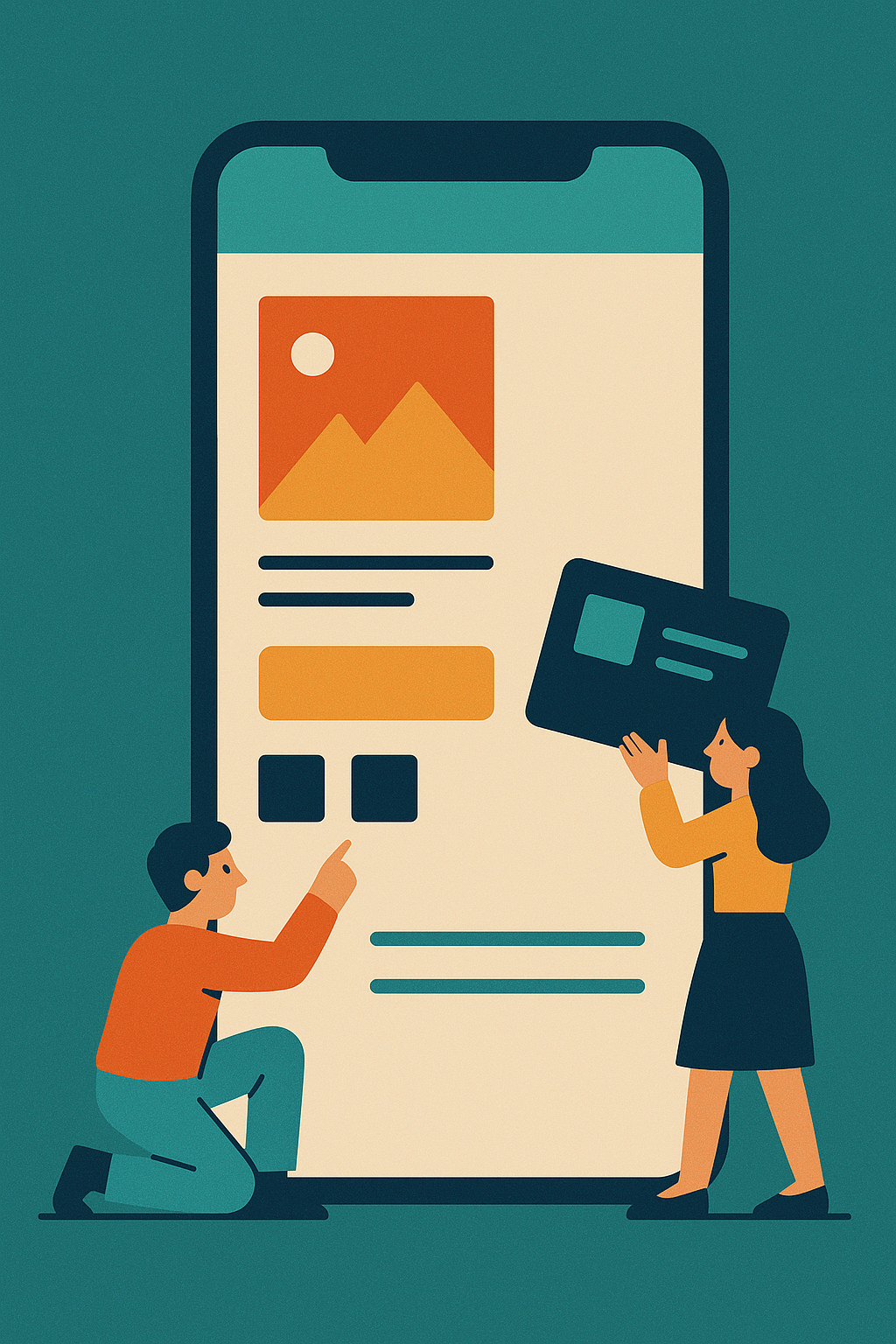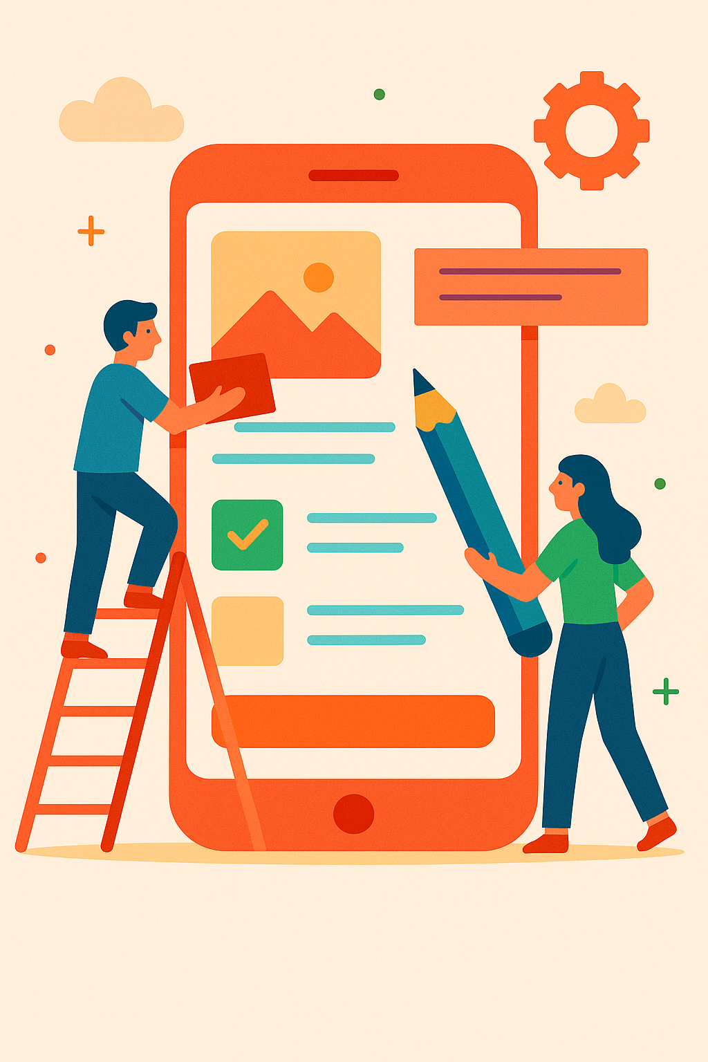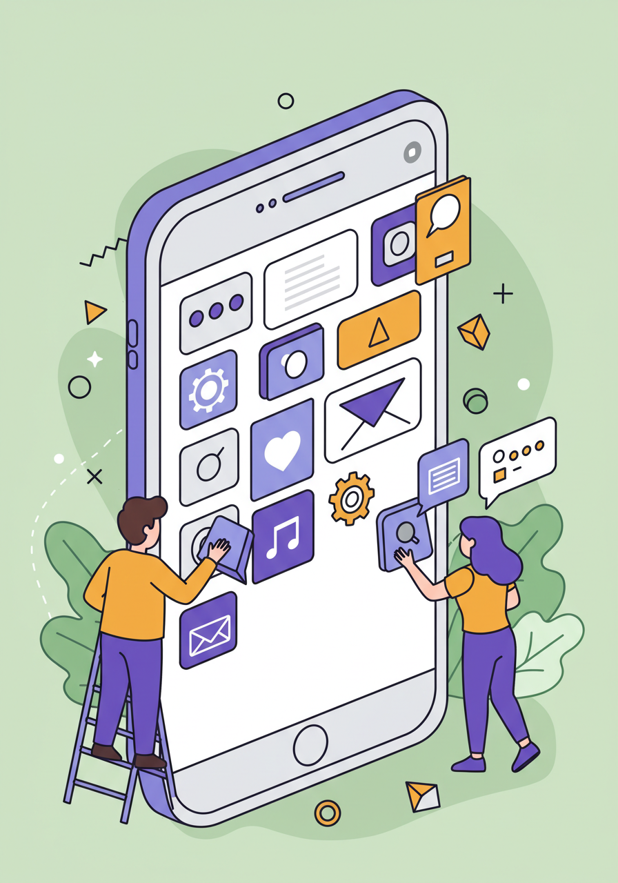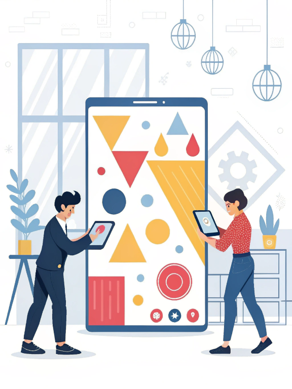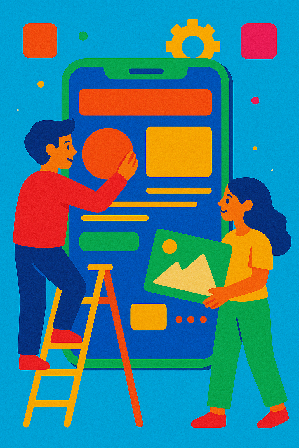 | a flat vector illustration of two small characters designing a giant mobile app with colors that pop | |||