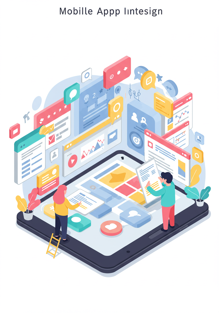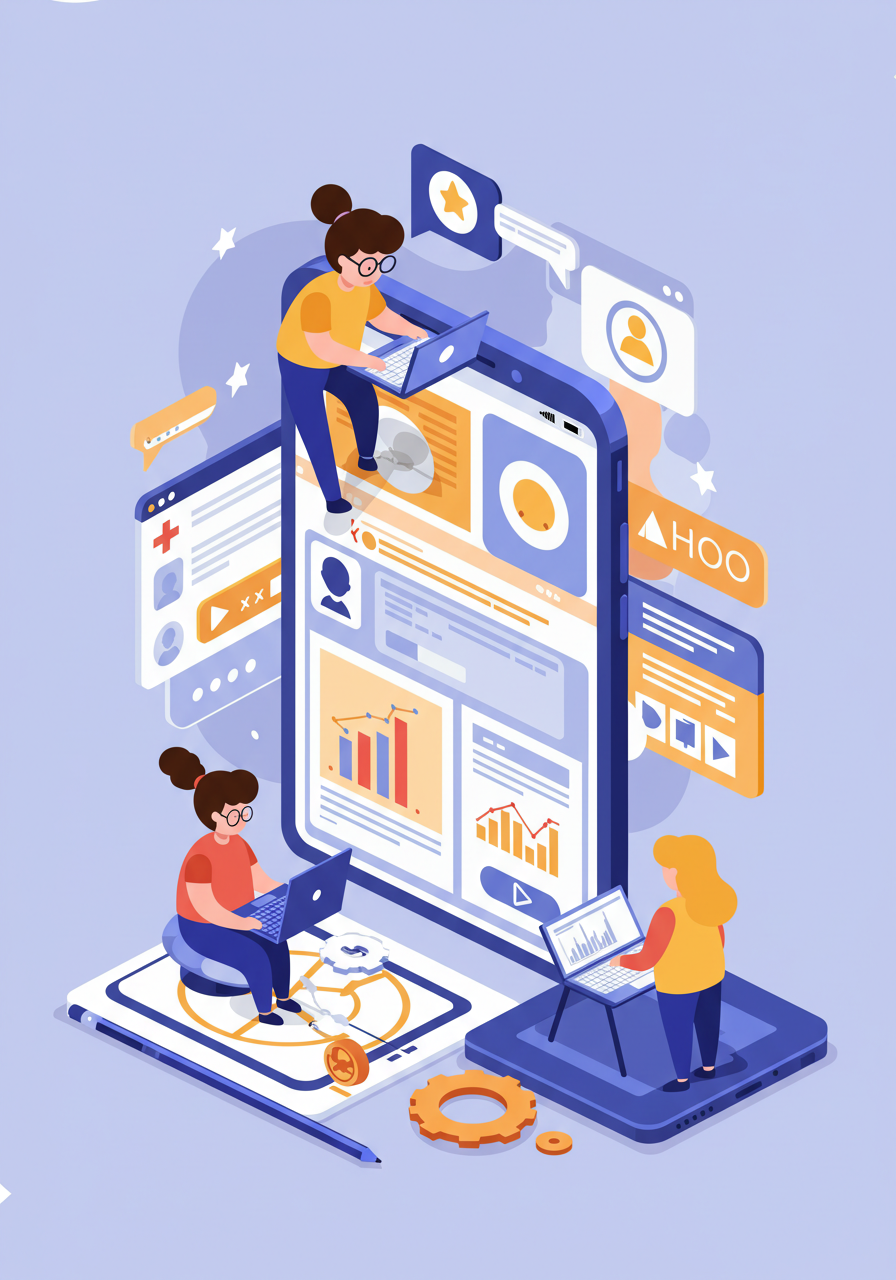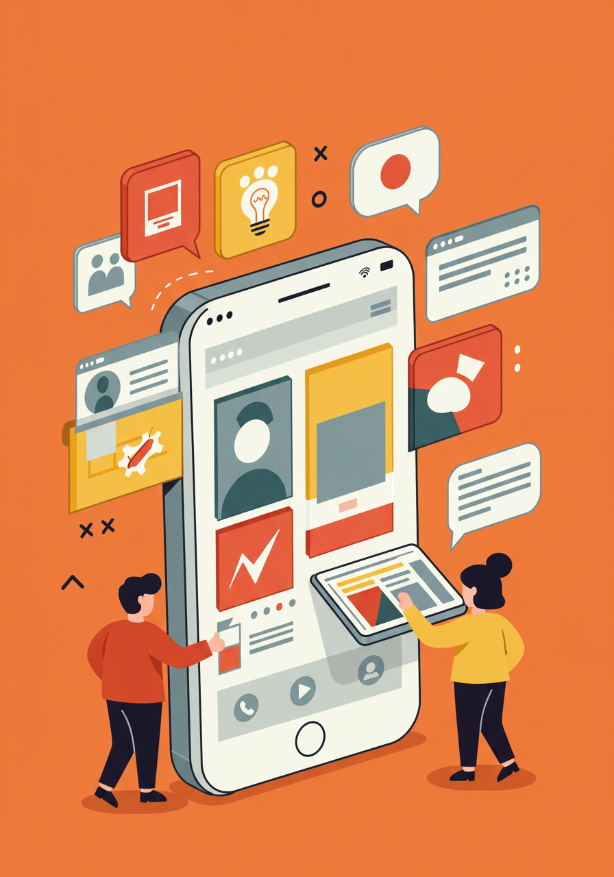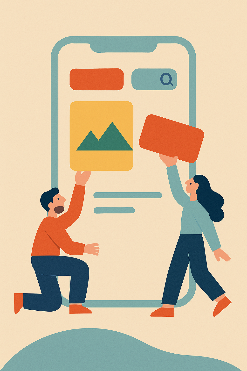 | a flat vector illustration of two small characters designing a giant mobile app with colors that pop | |||