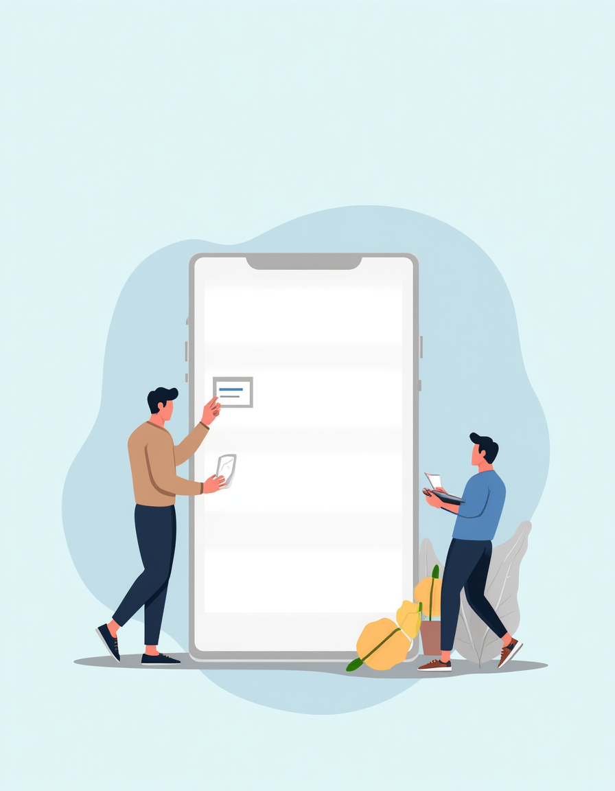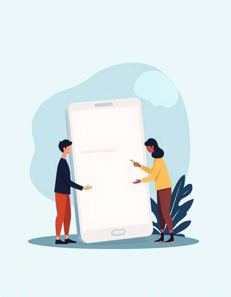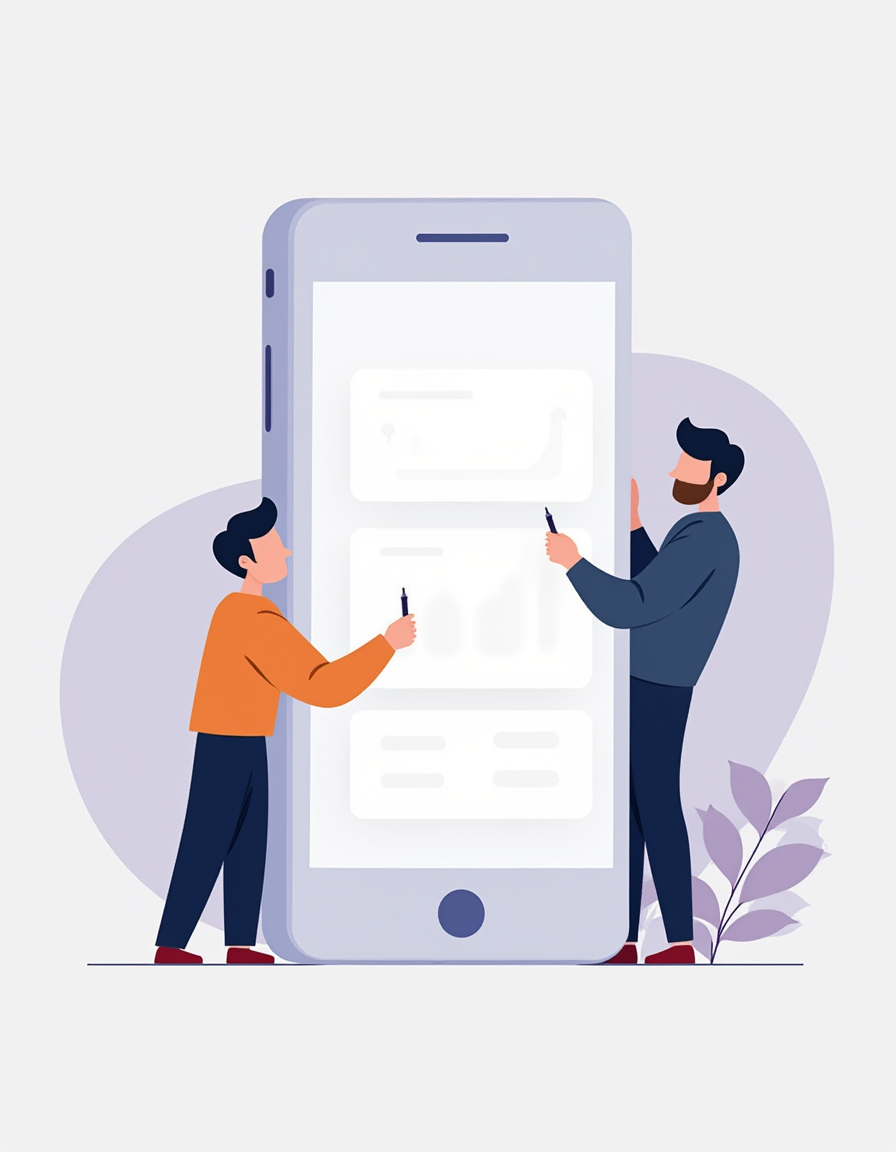 | a minimalistic flat vector illustration of two small characters designing a giant mobile app | |||