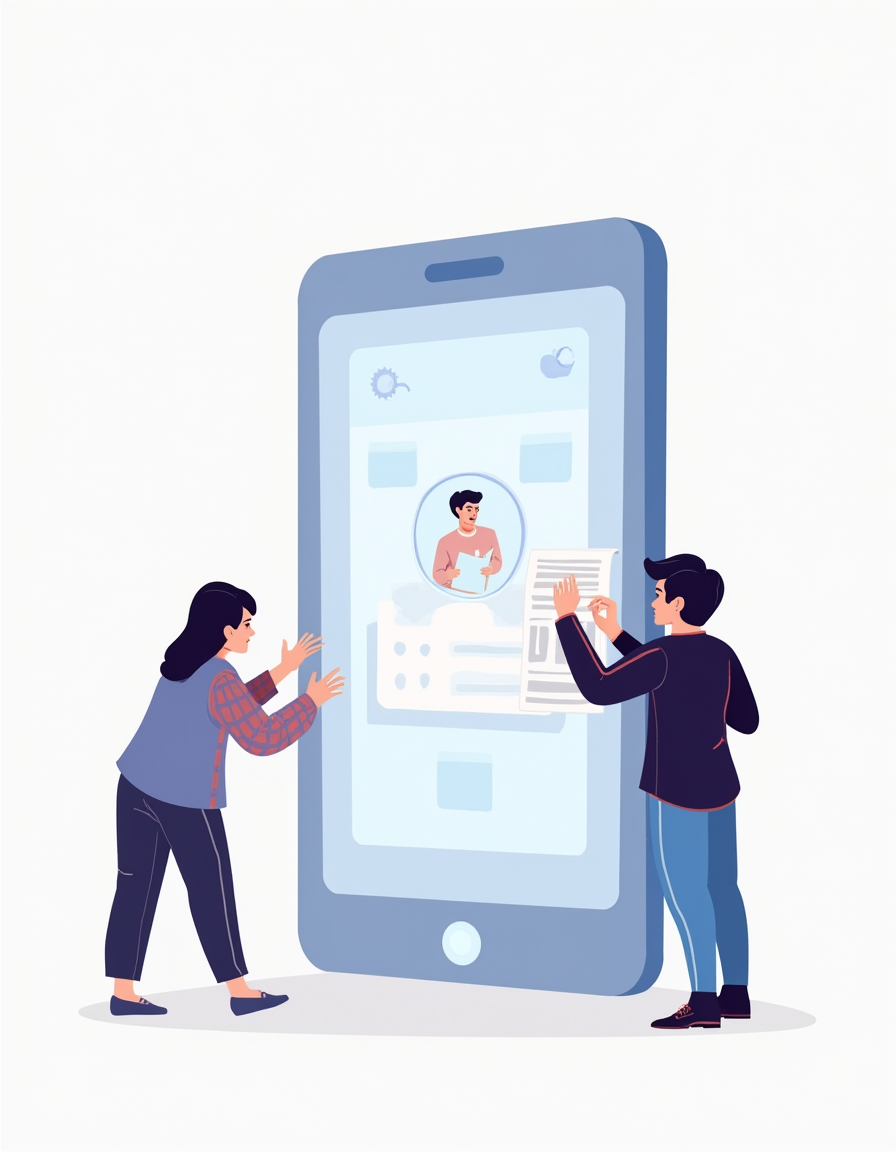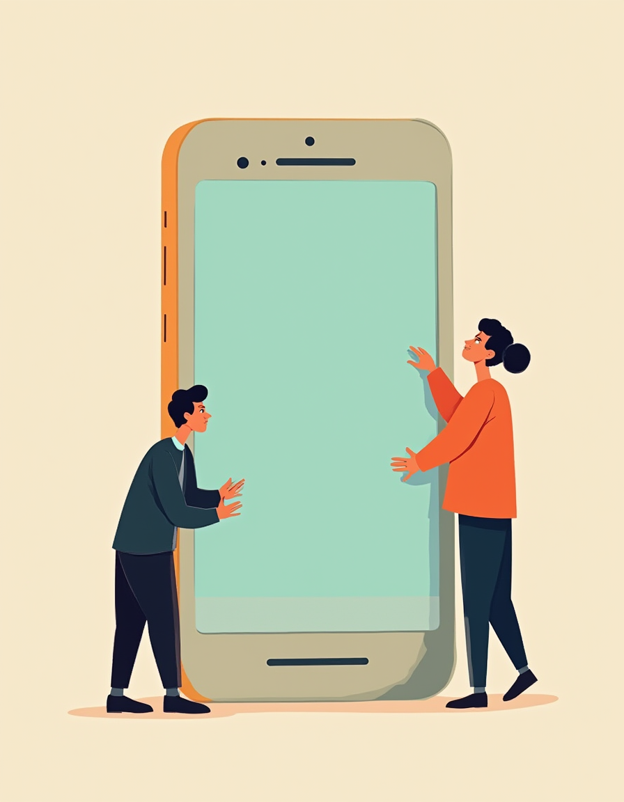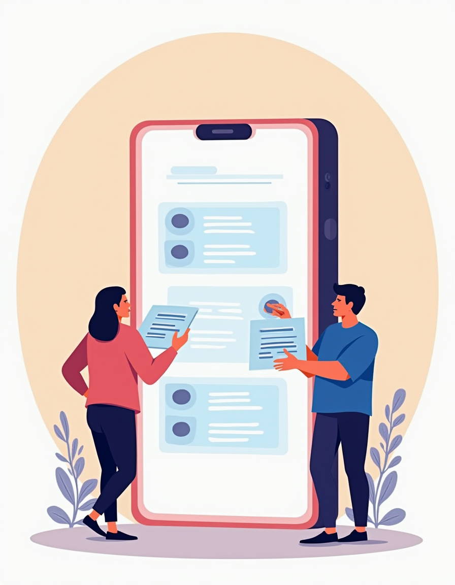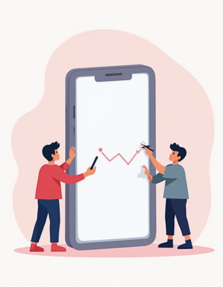 | a minimalistic flat vector illustration of two small characters designing a giant mobile app | |||