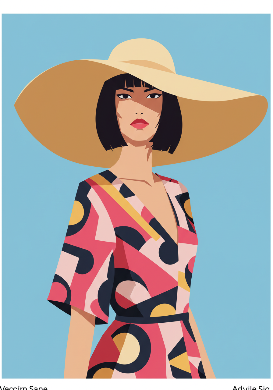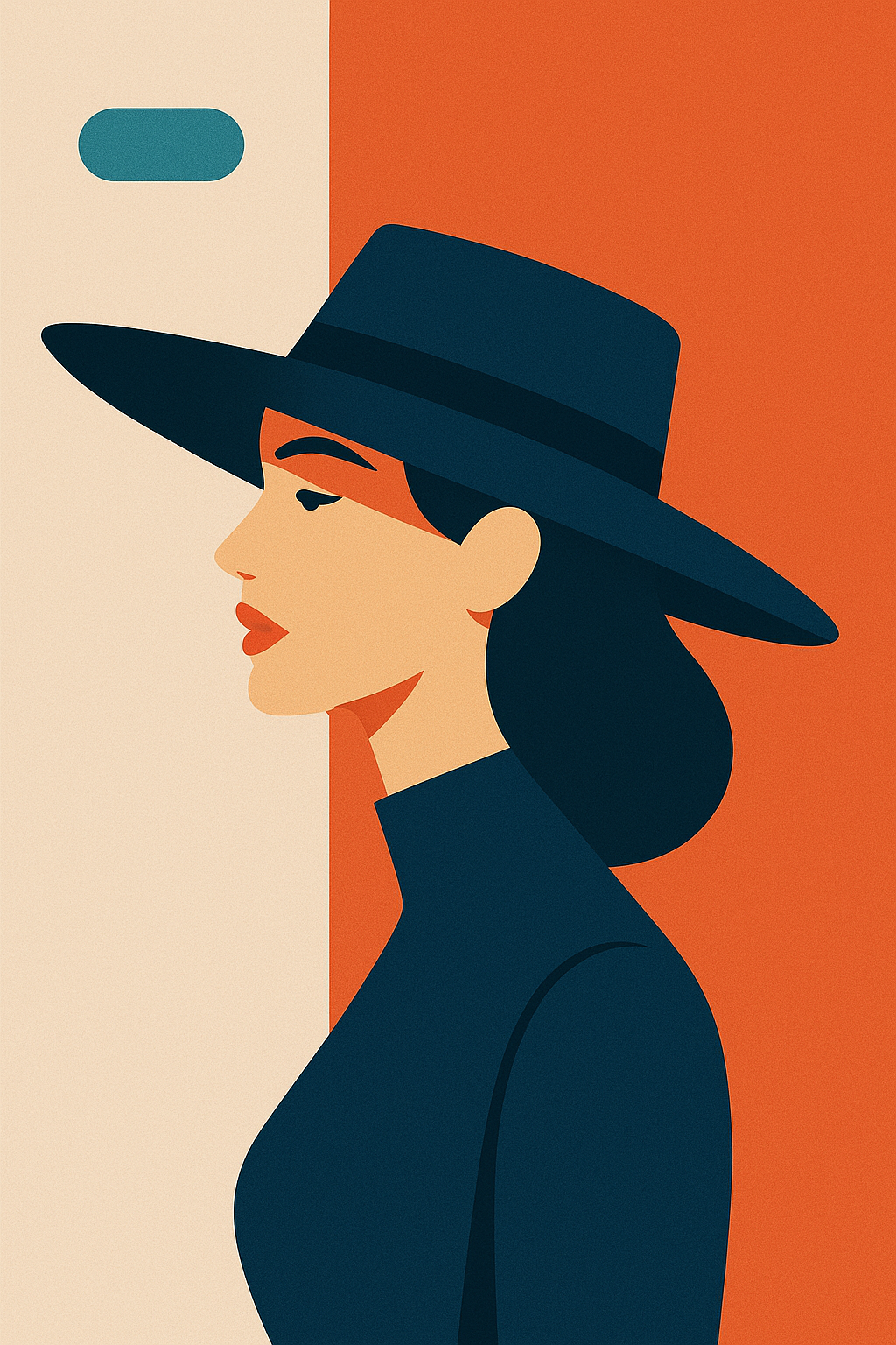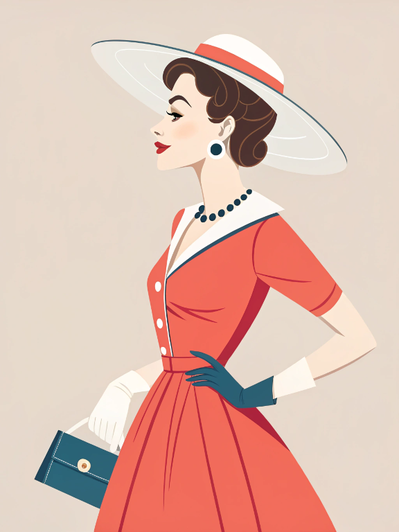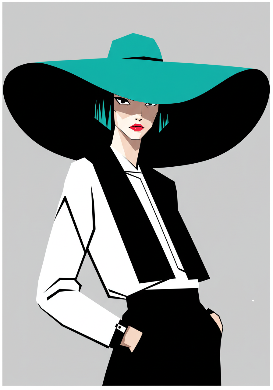 | a flat vector illustration of a fashionable woman wearing a hat, in the 1950s Swiss Style | |||