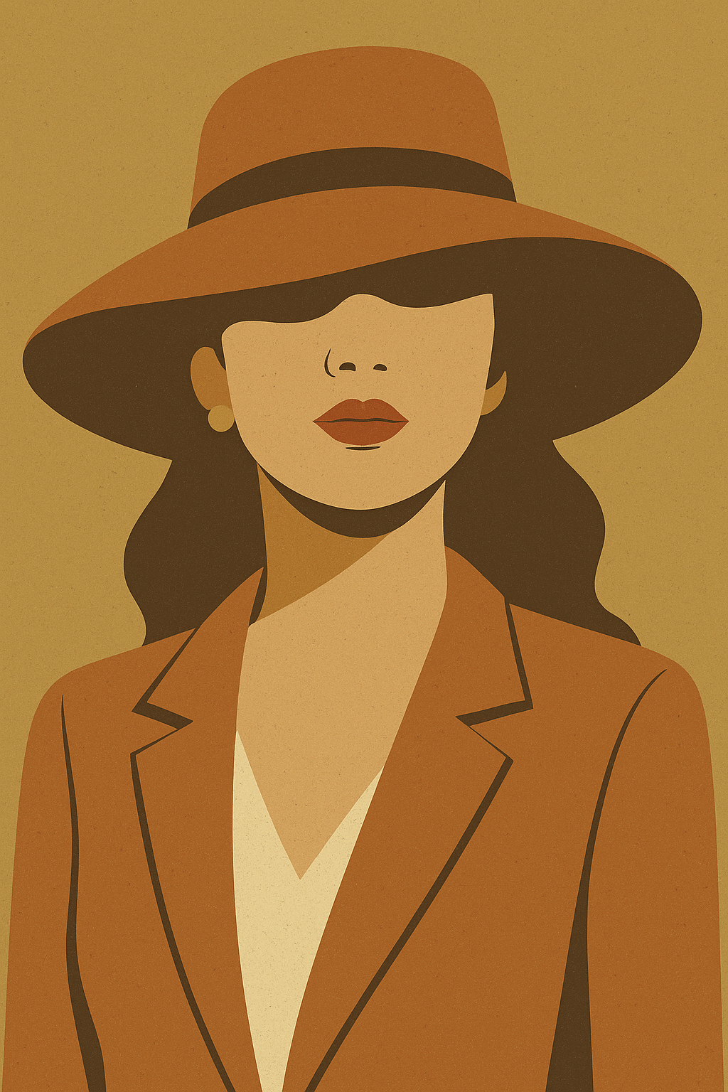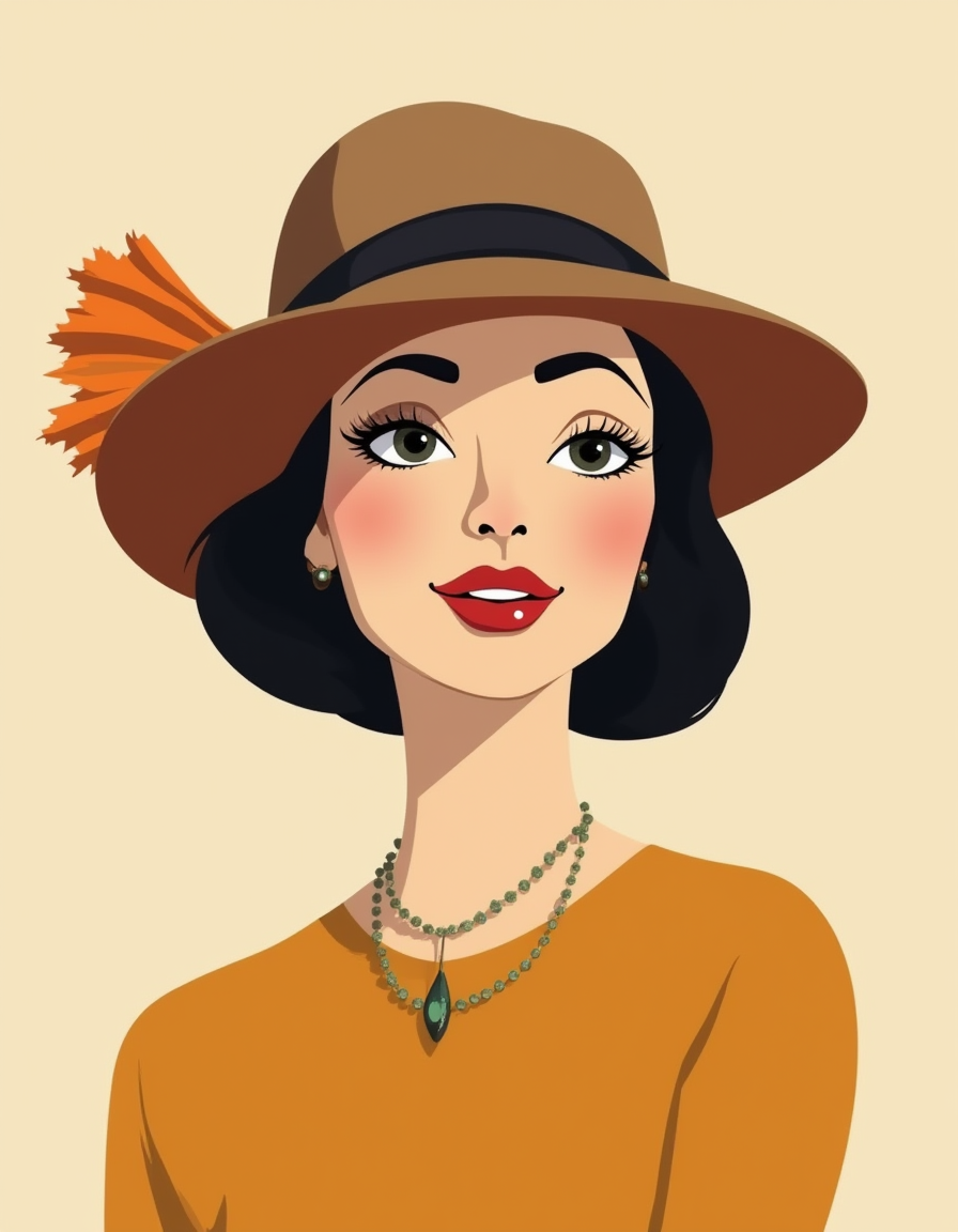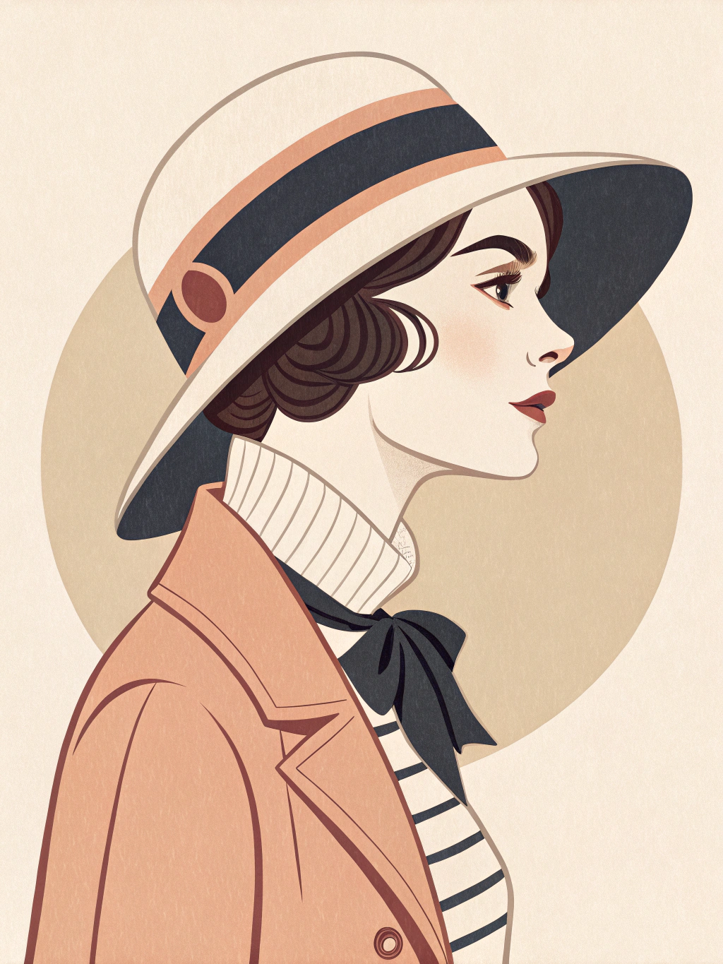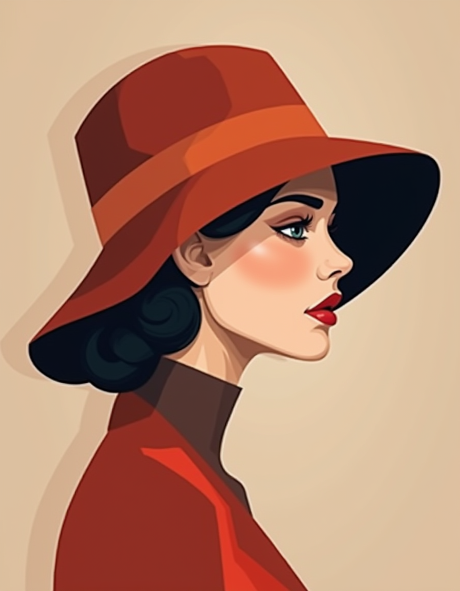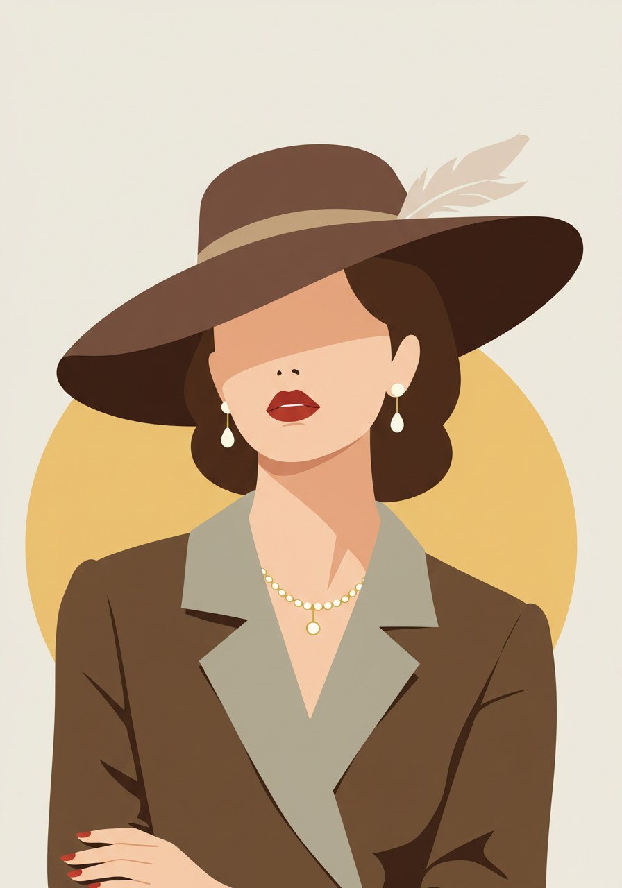 | a flat vector illustration of a fashionable woman wearing a hat, vintage colors | |||
