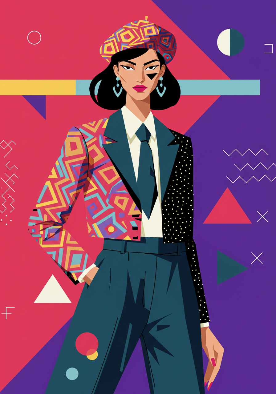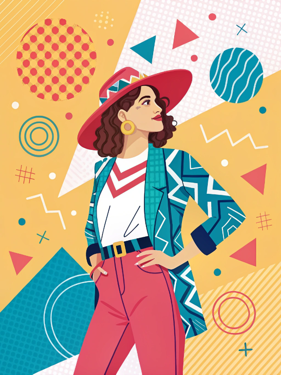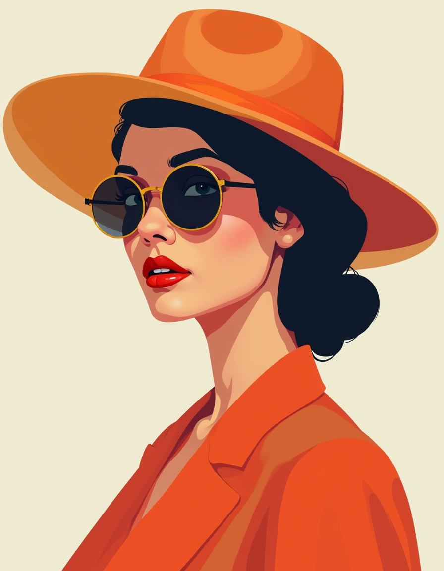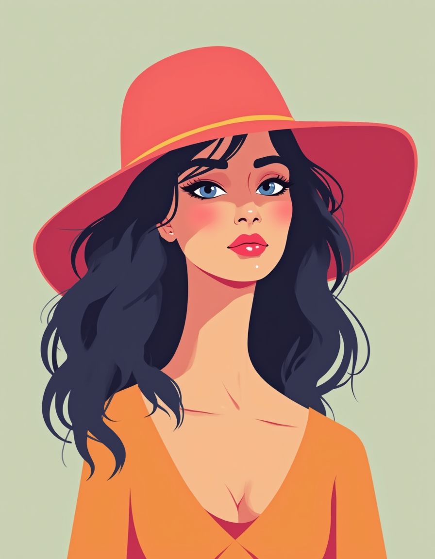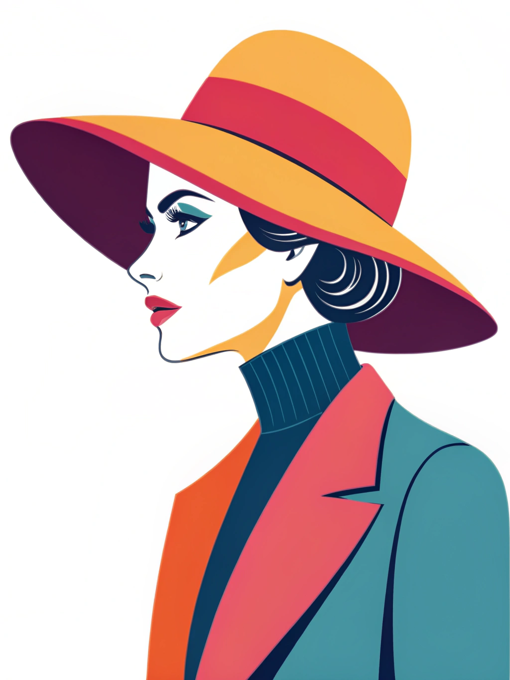 | a flat vector illustration of a fashionable woman wearing a hat with colors that pop | |||