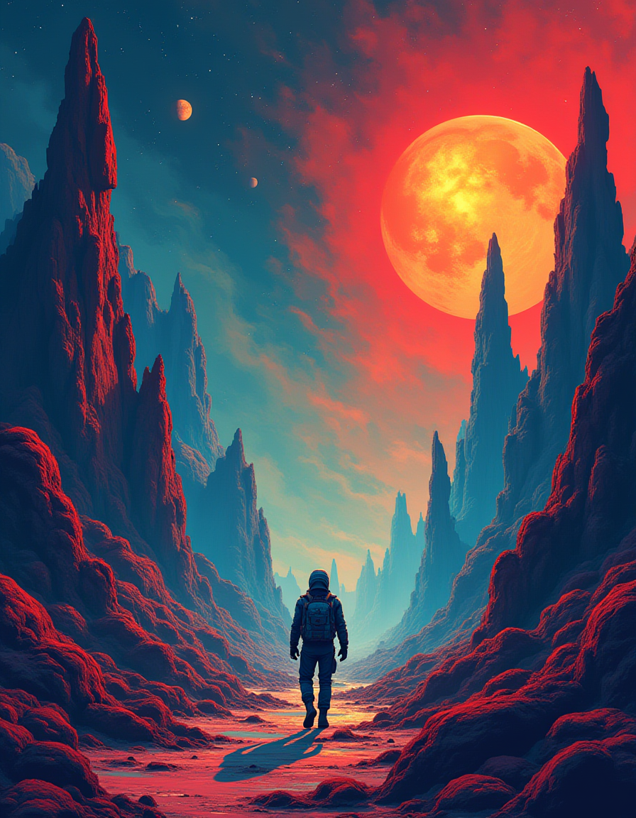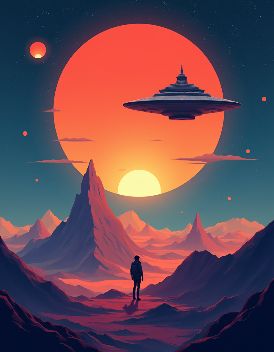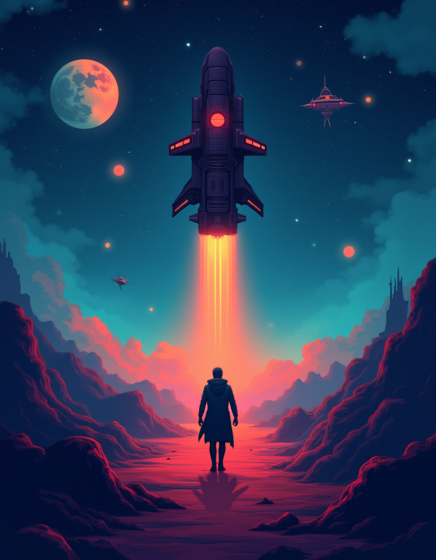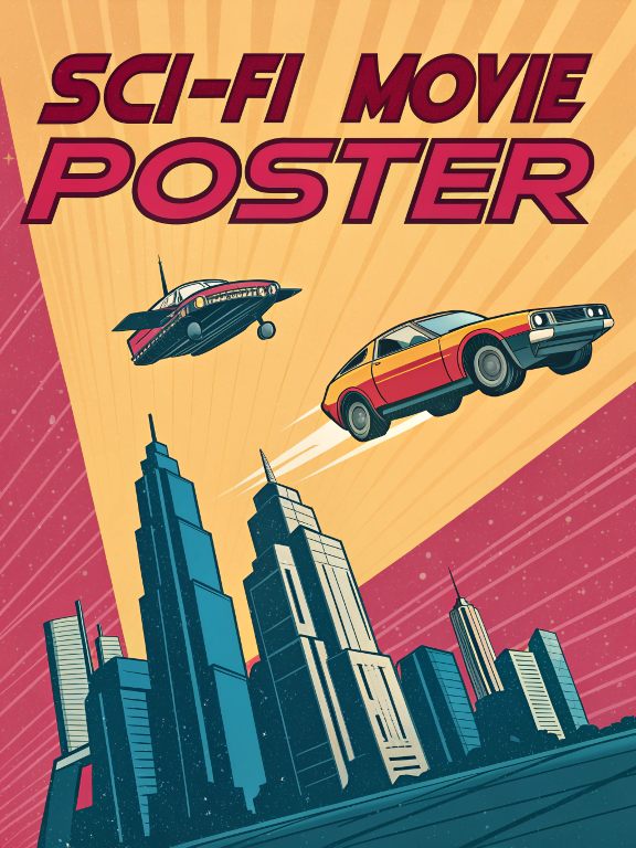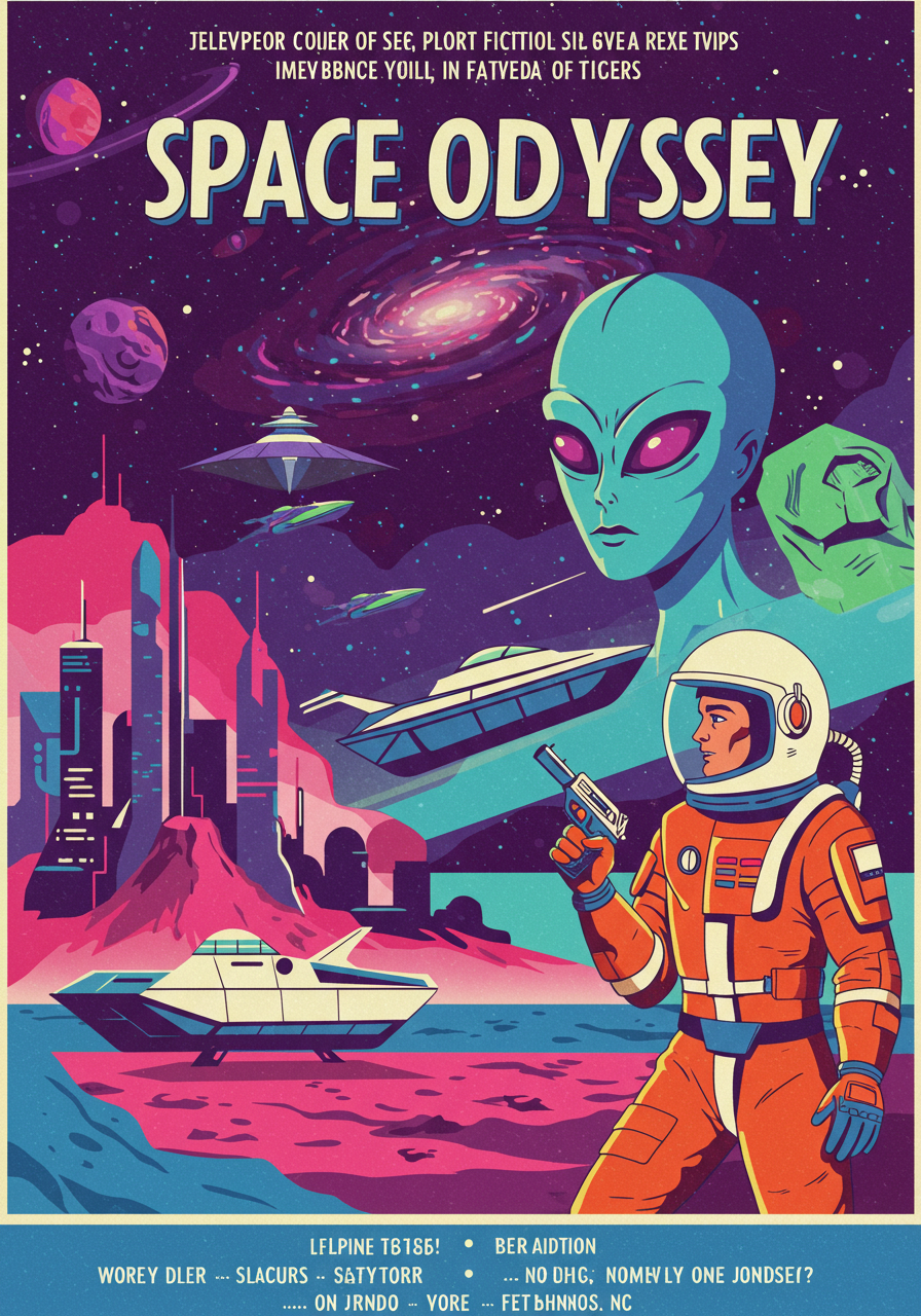 | a flat vector illustrative sci-fi movie poster with colors that pop | |||