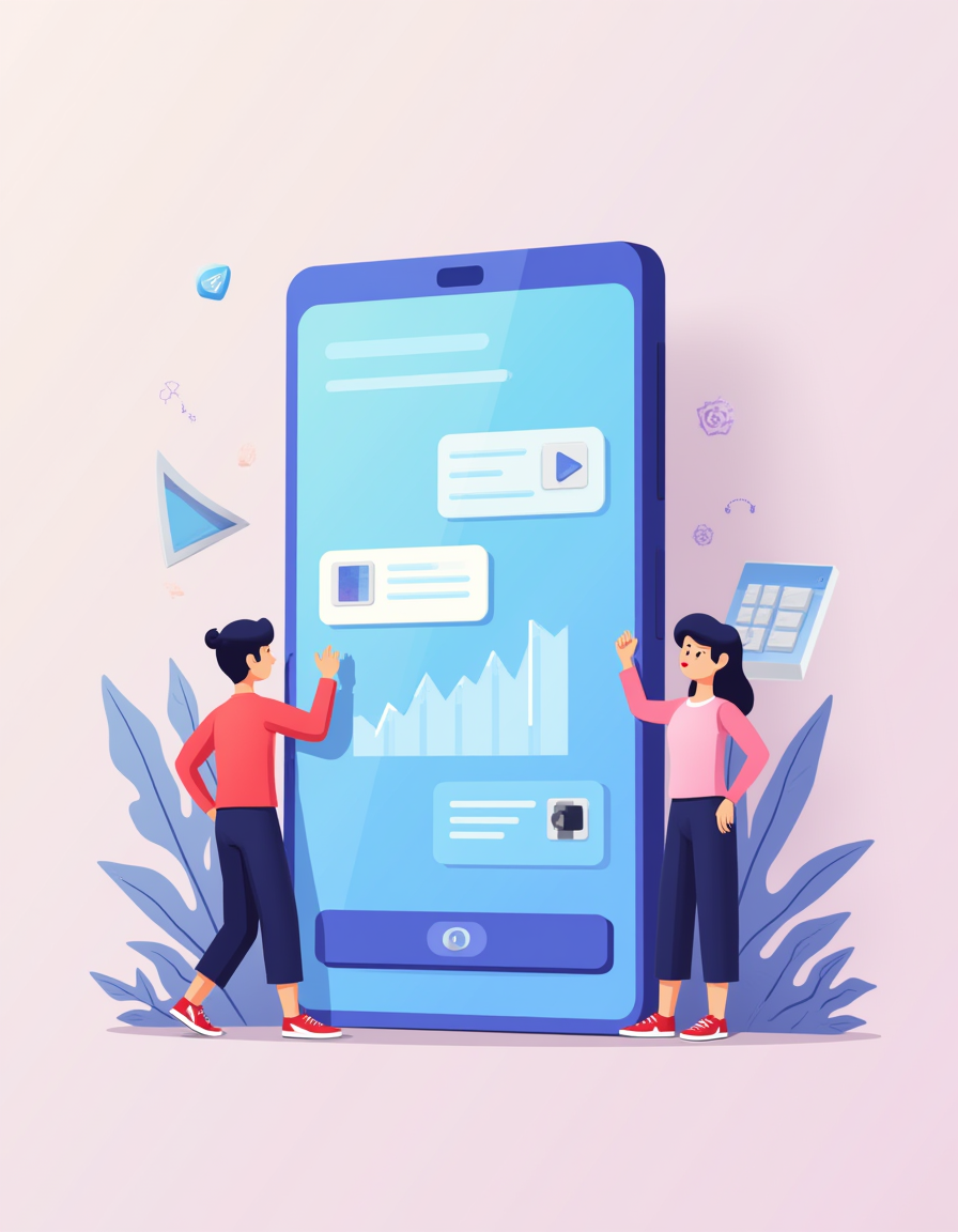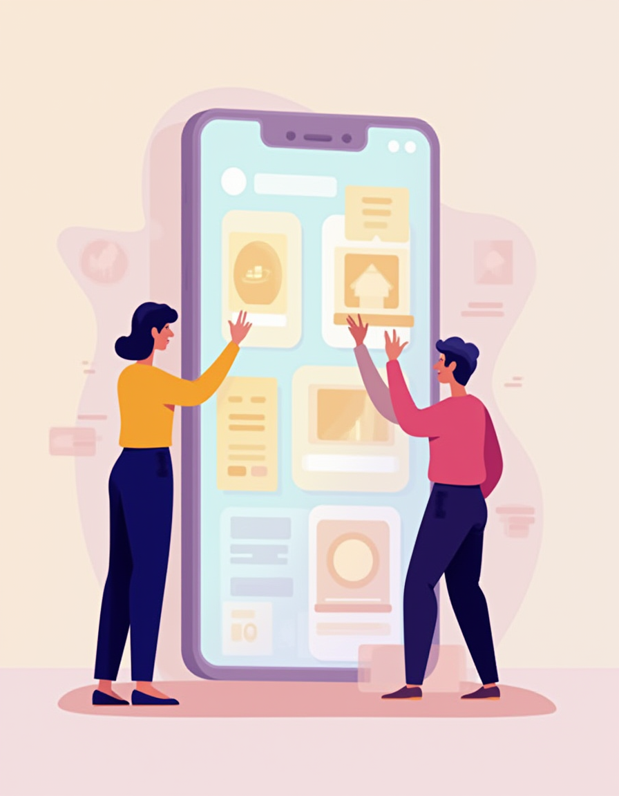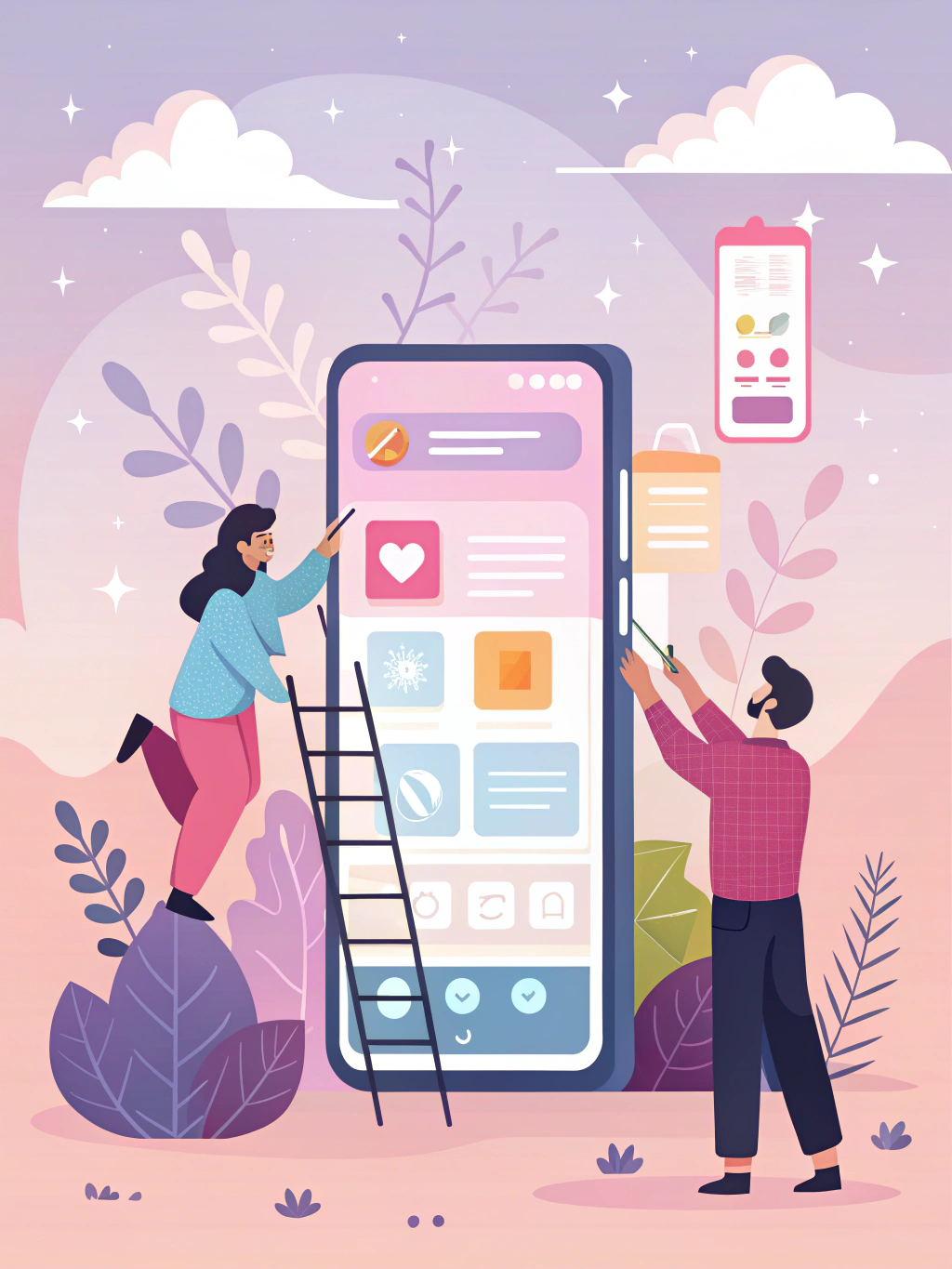 | a flat vector illustration of two small characters designing a giant mobile app with dreamy colors | |||