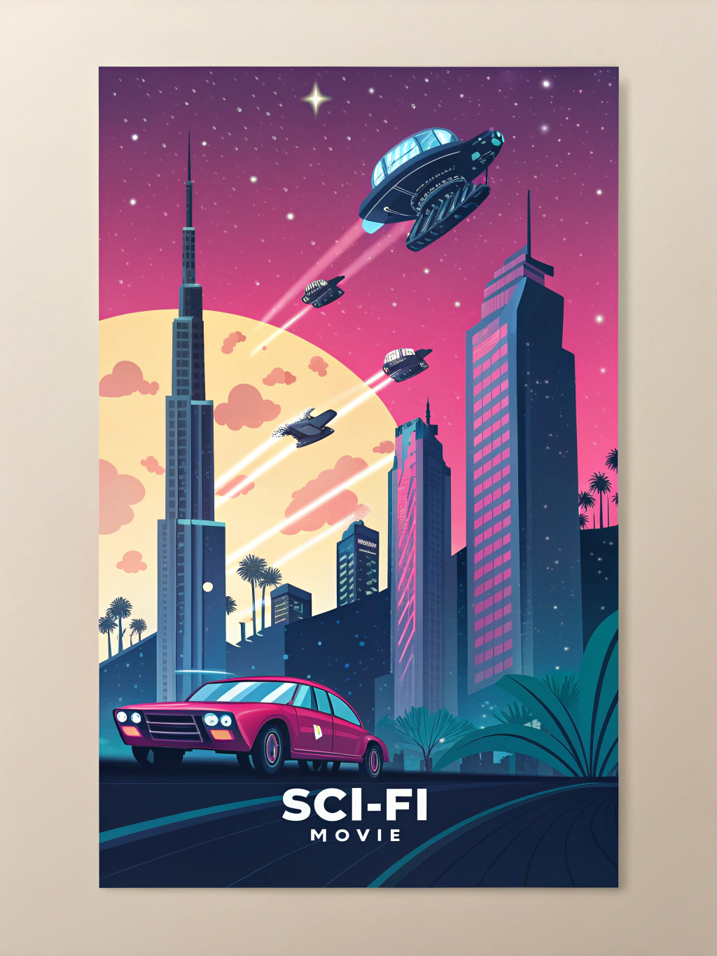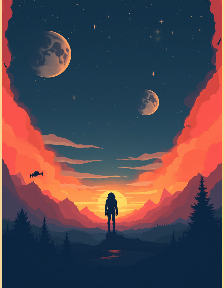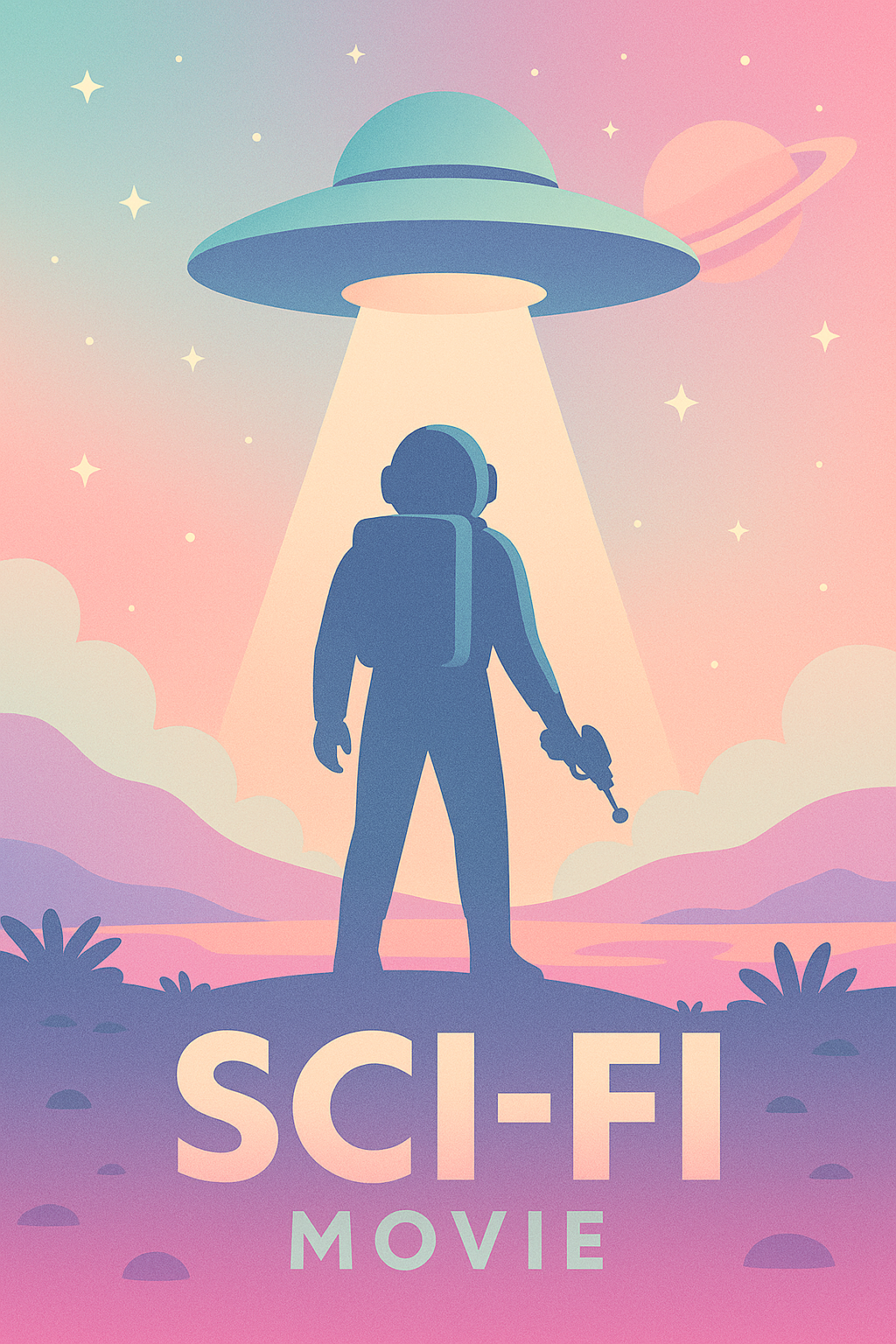 | a flat vector illustrative sci-fi movie poster with dreamy colors | |||