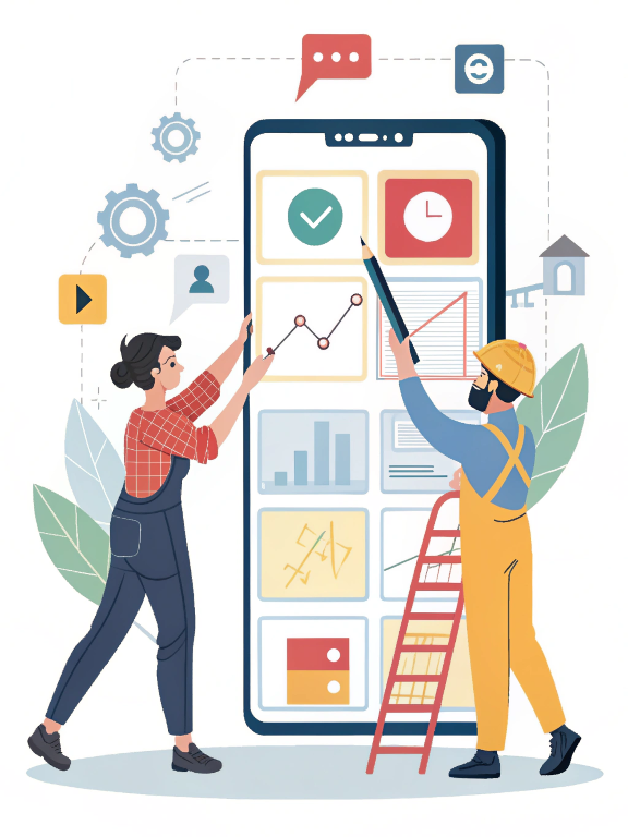 | a simple flat vector illustration of two small characters designing a giant mobile app | |||