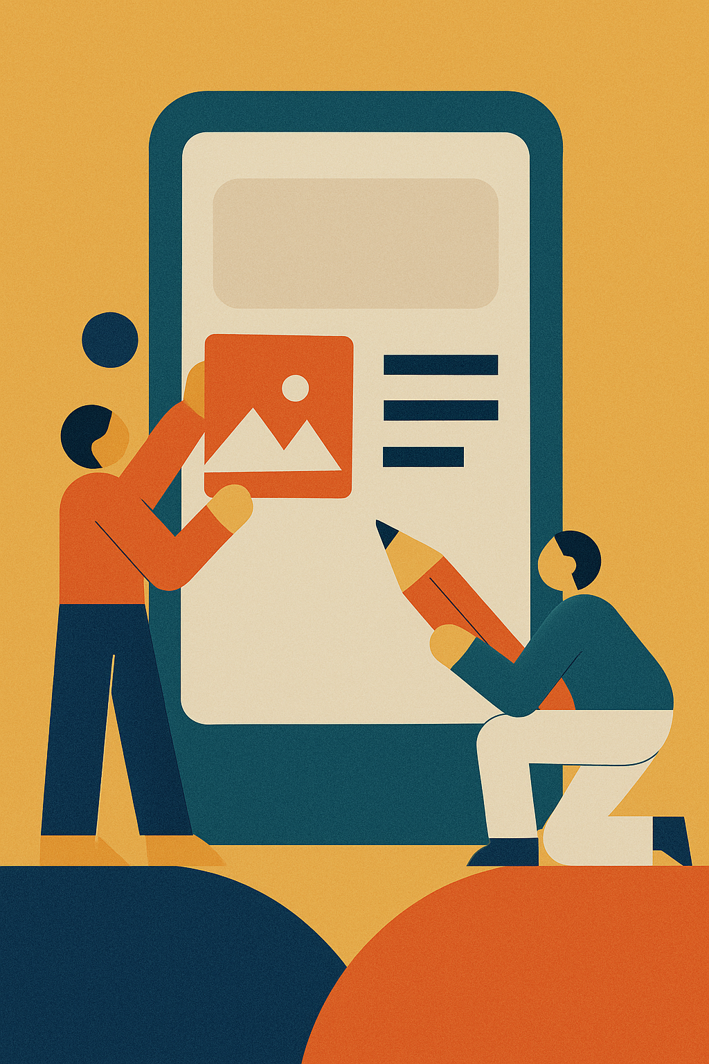 | a flat vector illustration of two small characters designing a giant mobile app, in the 1950s Swiss Style | |||