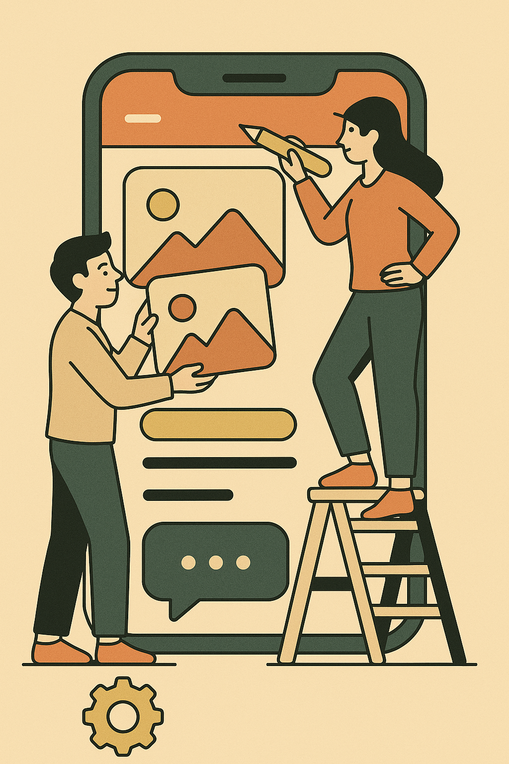 | a flat vector illustration of two small characters designing a giant mobile app, vintage colors | |||