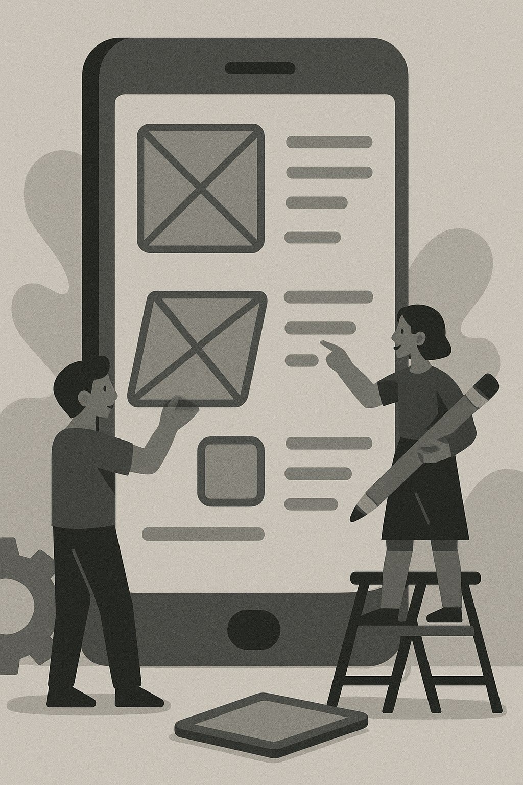 | a monochromatic flat vector illustration of two small characters designing a giant mobile app | |||