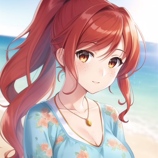 프롬프트: anime, photorealistic, 1girl, collarbone, wavy hair, looking at viewer, upper body, necklace, floral print, ponytail, freckles, red hair, sunlight