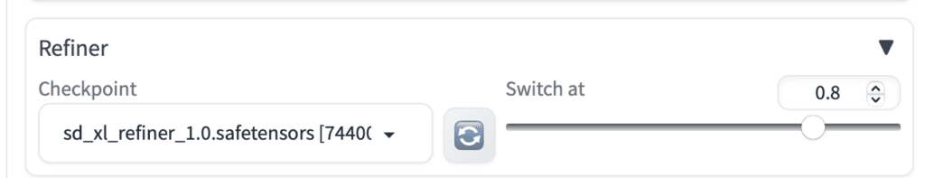 Refiner 모델을 사용할 경우, 먼저 Refiner 영역을 열고 아래와 같이 지정합니다.