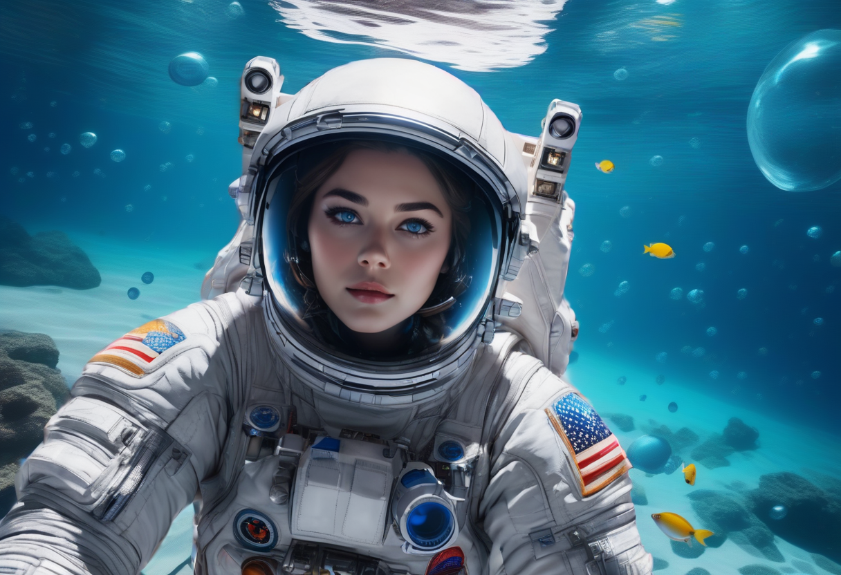 프롬프트: woman in space suit, underwater, full body, floating in water, air bubbles, detailed eyes, deep sea in background, water surface, god ray, tropical fishes