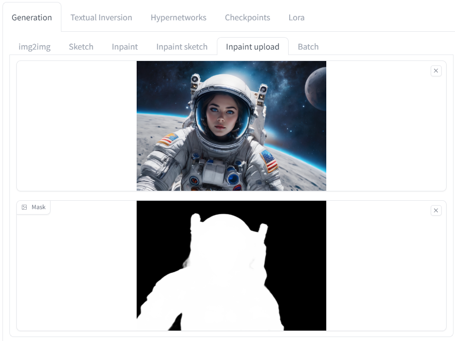 img2img 페이지로 들어가서 [Inpaint Upload] 탭으로 들어갑니다. 윗쪽 캔버스에는 원래의 이미지, 아래쪽 캔버스에는 마스크로 저장한 이미지를 선택합니다.